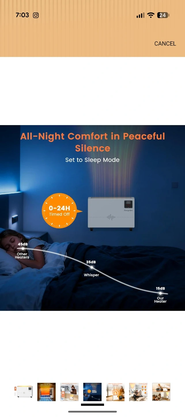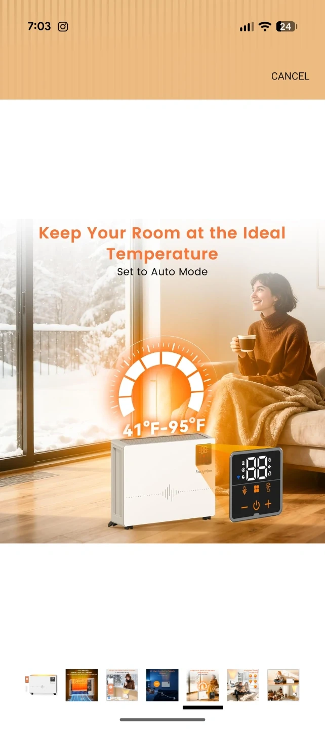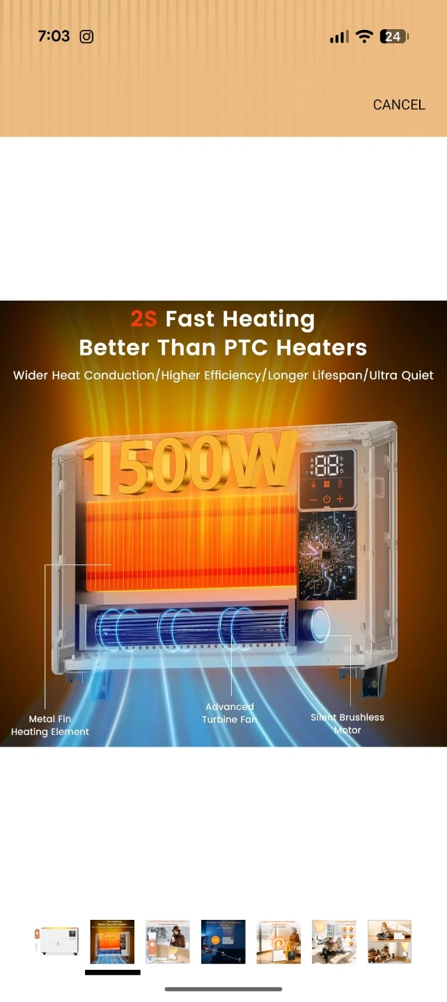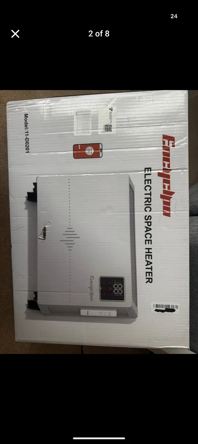 This white Encyclpo electric heater offers quick heating with 1500W power. It features 9-level heating settings and a 0-24H timer for convenience. It's whisper quiet and includes a remote and app control.
