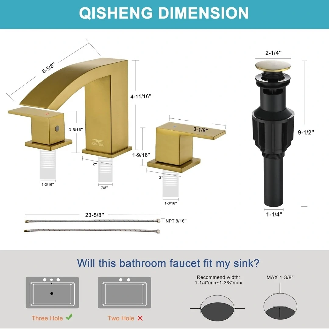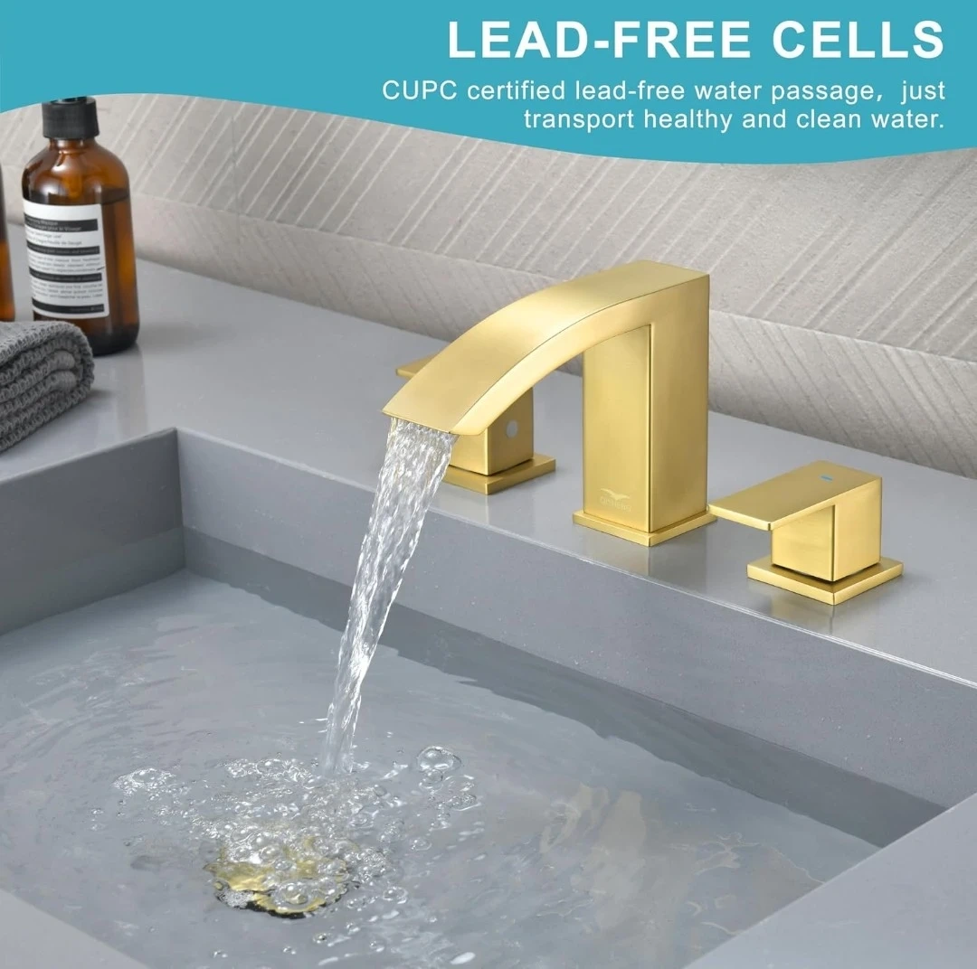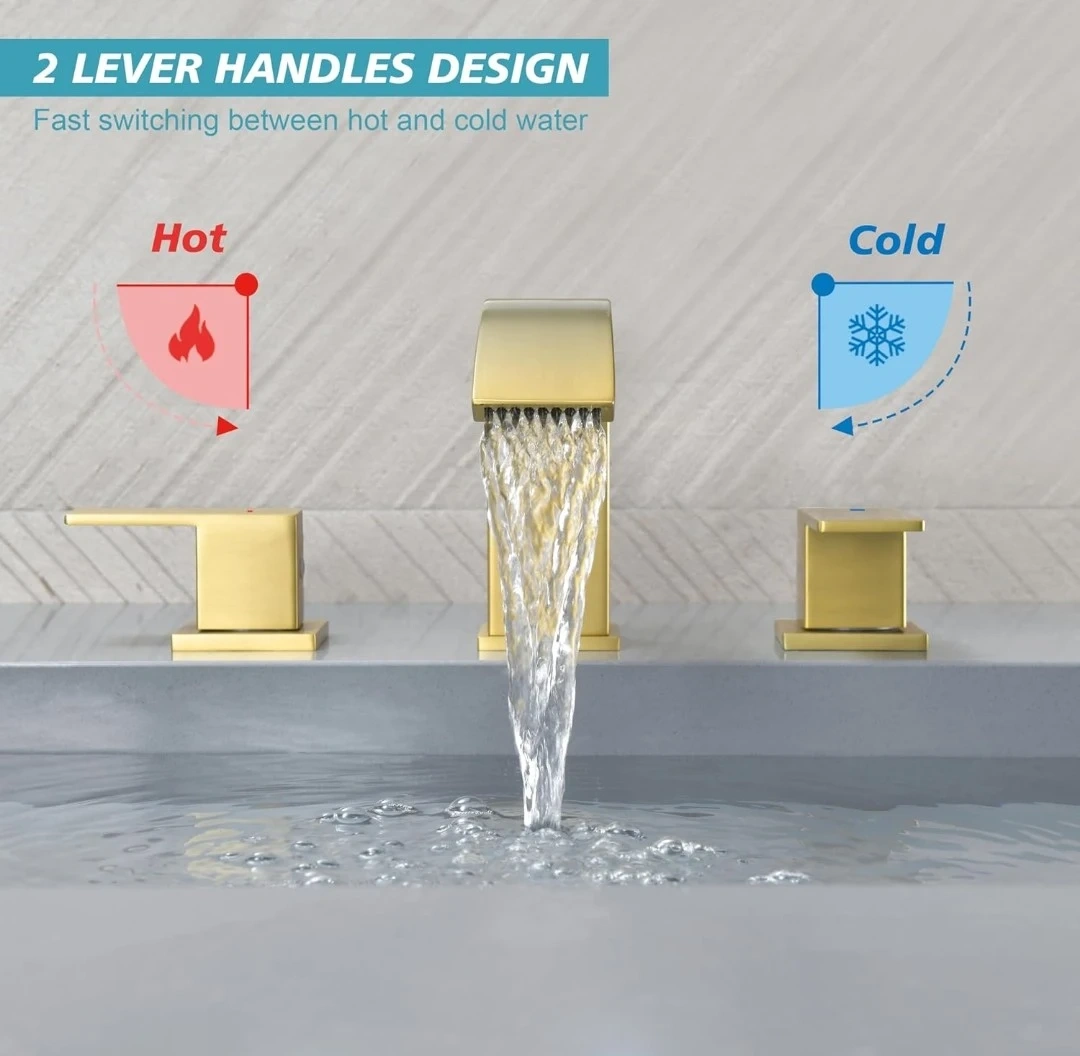 QISHENG Brushed Gold Waterfall Bathroom Faucet, 8 Inch 3 Hole Widespread Bathroom Faucet with Pop Up Drain and Hose, Two Handles for Basin Lavatory Vanity
