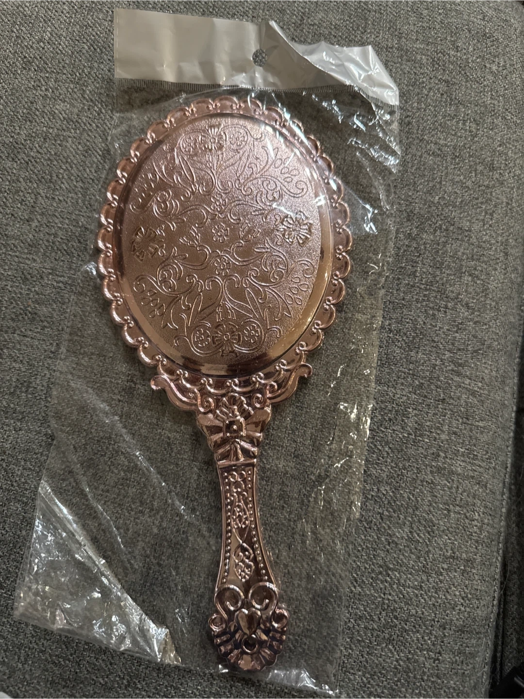 This is a handheld mirror with a vintage-inspired decorative frame. It's a pretty rose gold color and comes in its original packaging. The mirror itself is clear and functional for quick touch-ups.