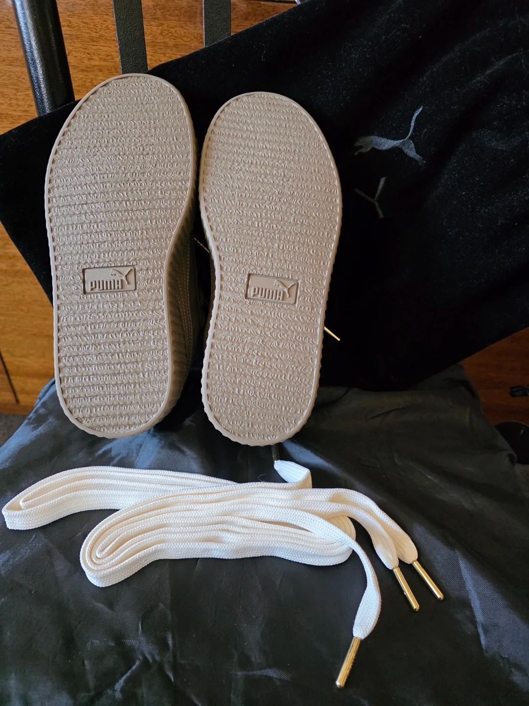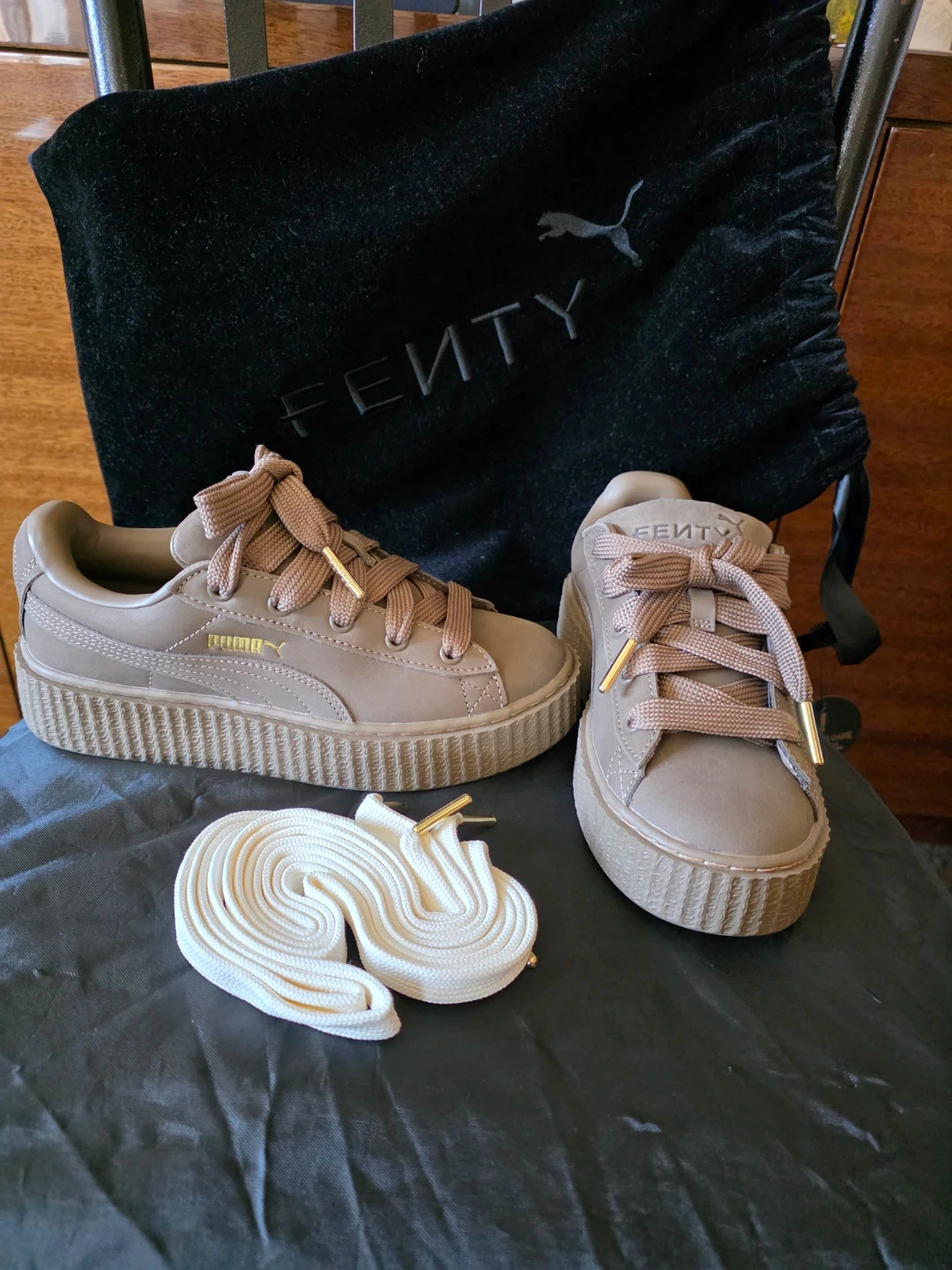 Puma x Fenty Creeper sneakers in a tan color. Features a thick platform sole and includes extra white laces with gold tips. Comes with a black velvet drawstring dust bag.