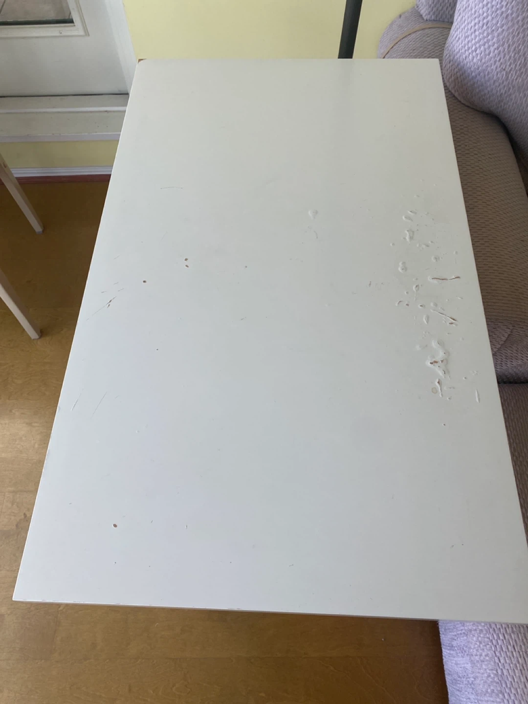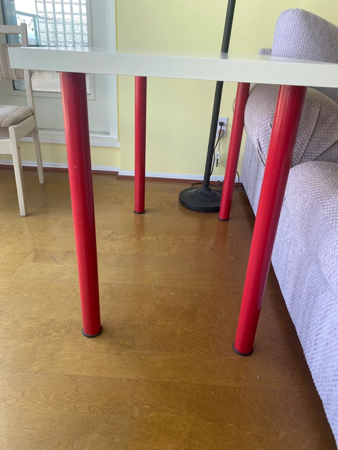 A white rectangular side table with four bright red cylindrical legs. It's a simple design that's great for holding drinks or a lamp next to a couch. Minor scuffs on the surface.