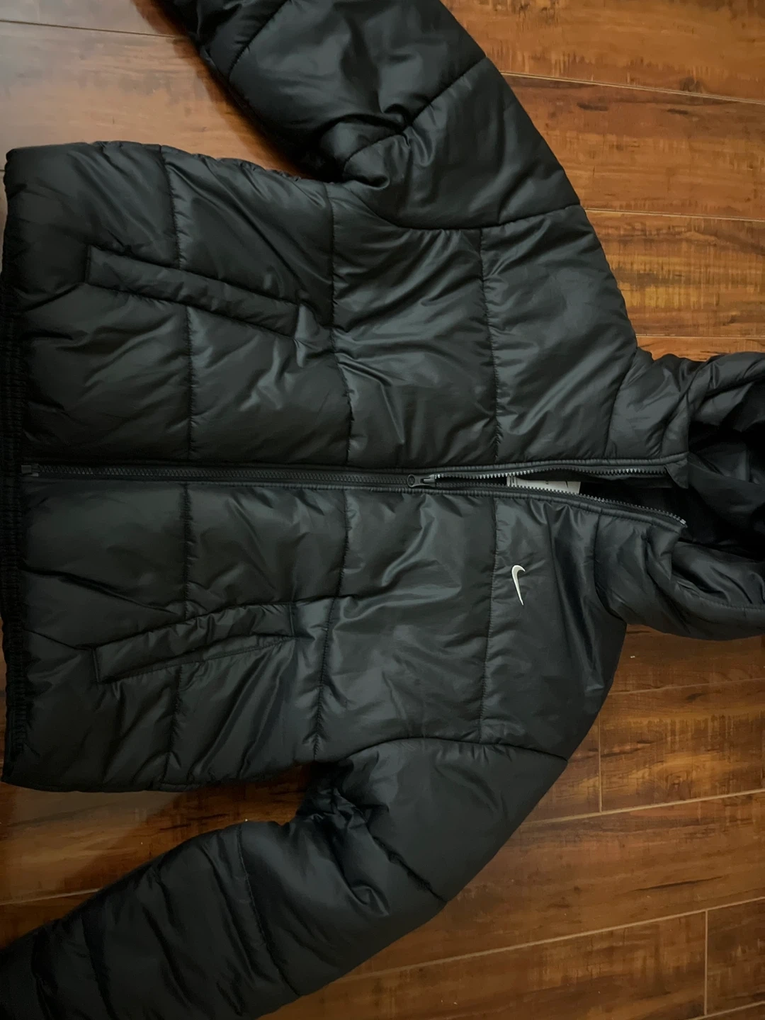 This is a black Nike puffer jacket. It's a quilted, insulated jacket with a full zip closure. It has a hood and two pockets.