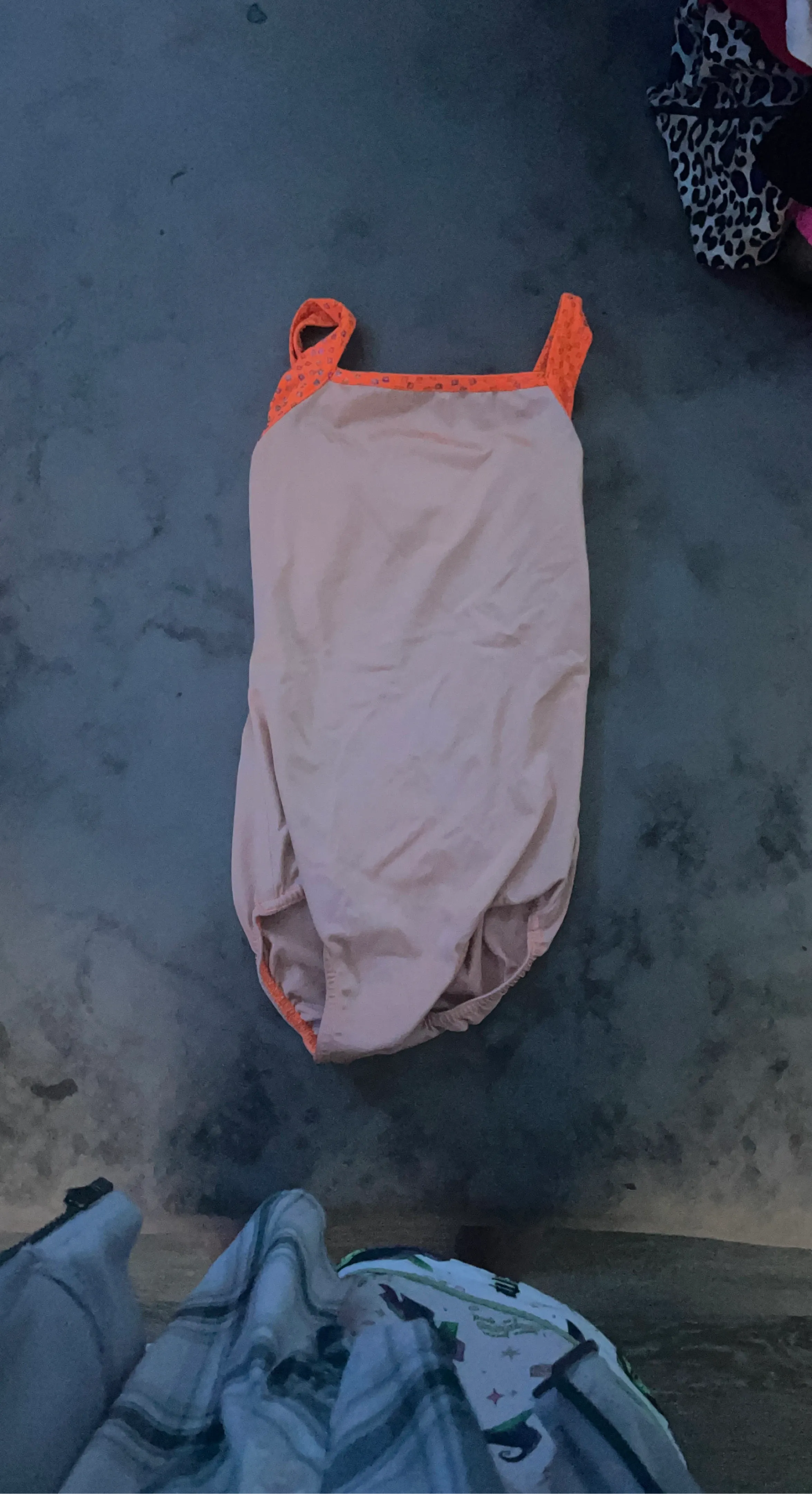 This is a girls' leotard in a light pink colour. It features bright orange trim with a subtle pattern. It's designed for comfort and movement. Perfect for dance or gymnastics practice!