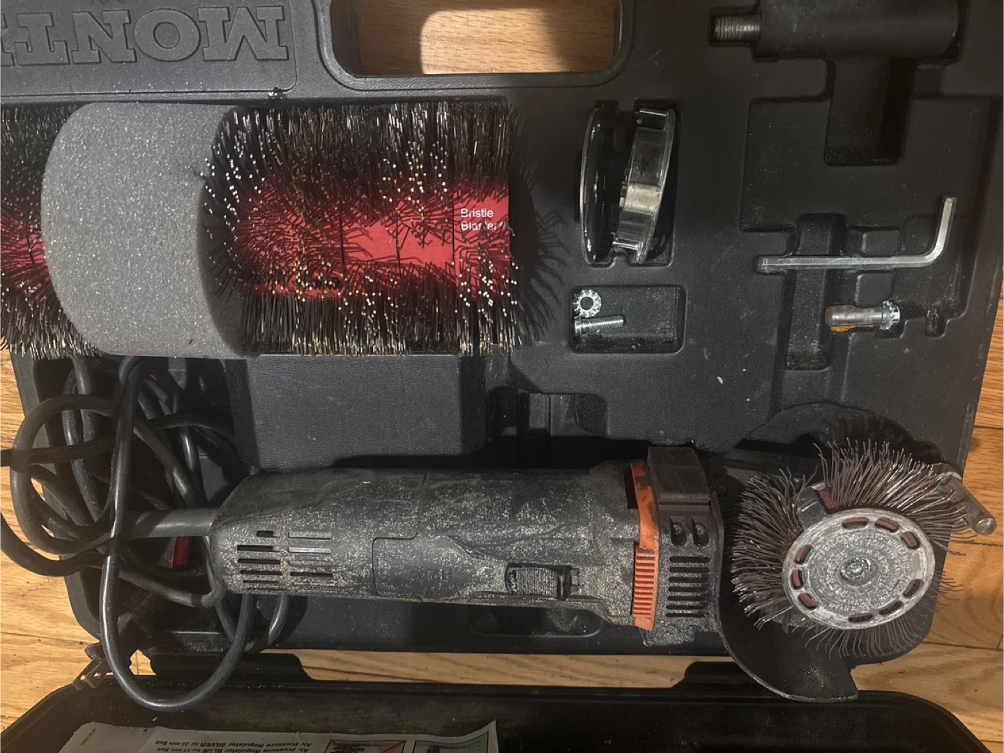 Monti bristle blaster eletric set 110v with case as seen in pictures . Used comes with everything seen in pictures. everything works