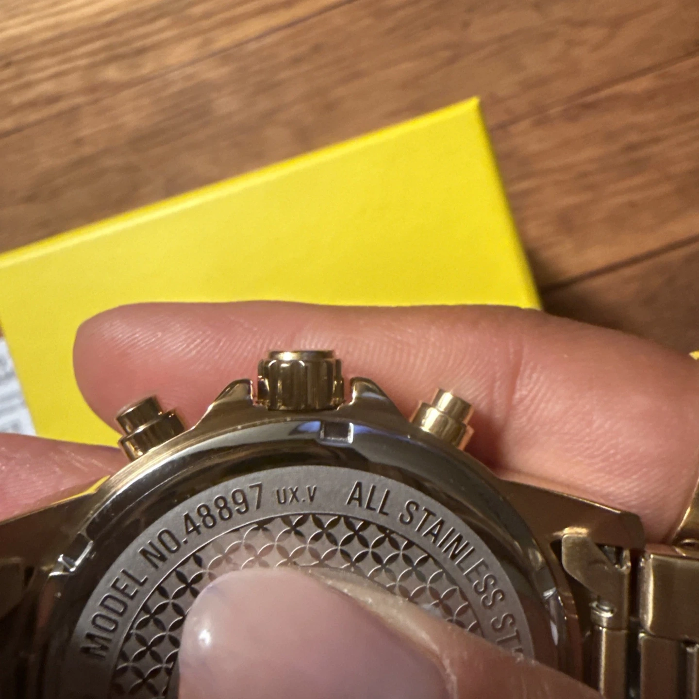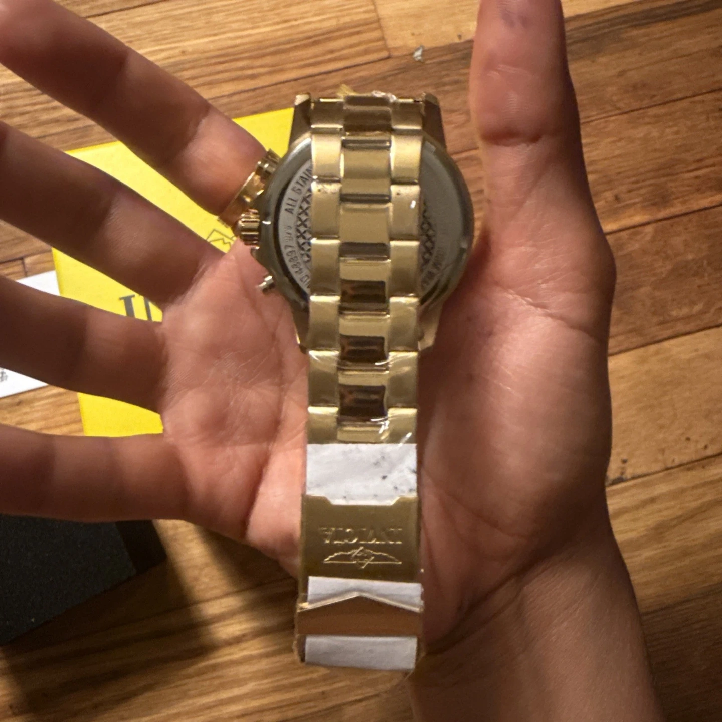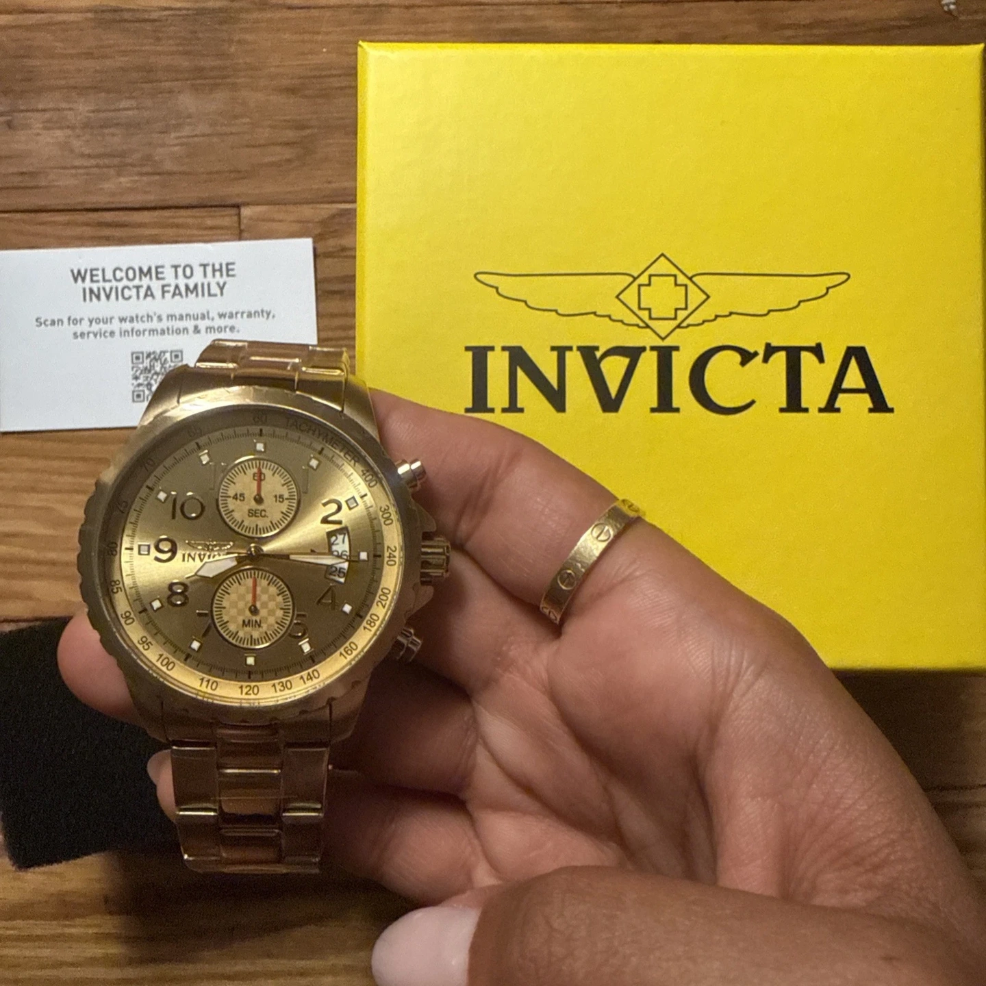 Invicta Specialty watch, model 48897. Features a stainless steel case and band, golden dial, and quartz analog movement. Water-resistant up to 30 meters. Case size is 45mm. Feel free to message if you have any questions!