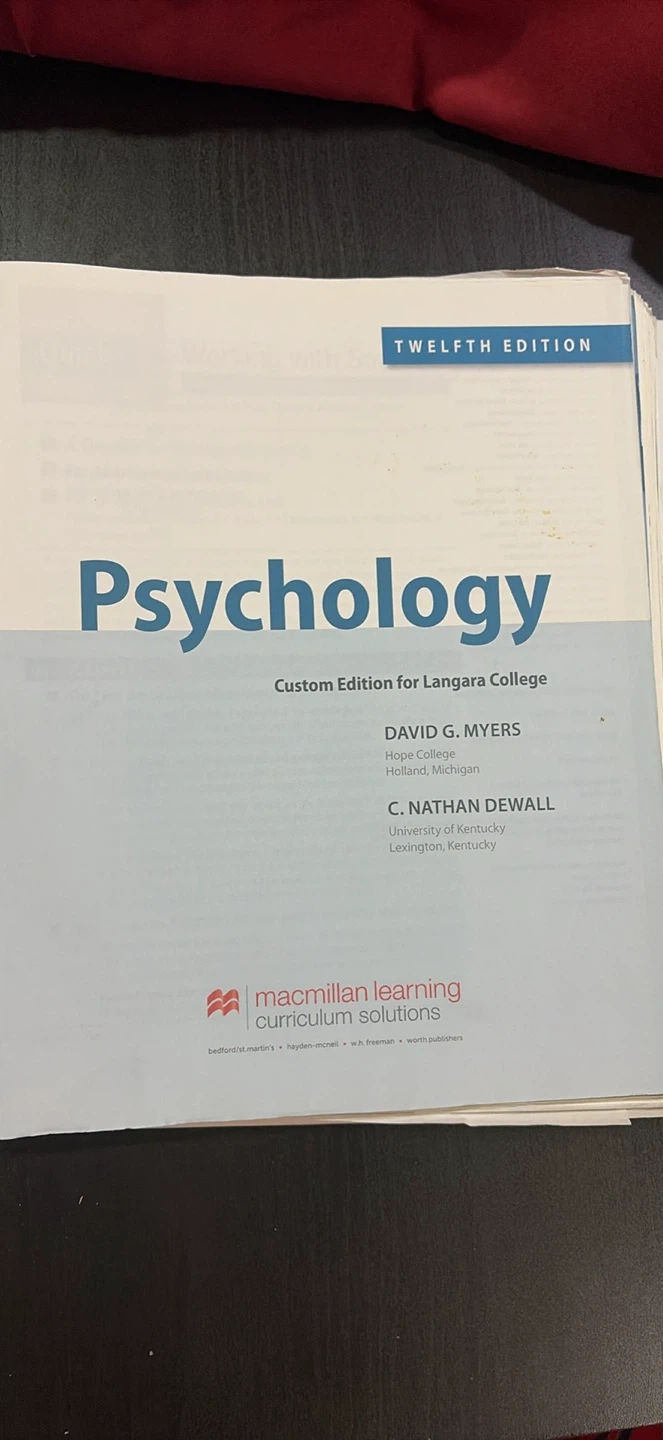 Psychology textbook, Custom Edition for Langara College, Twelfth Edition. Authors are David G. Myers and C. Nathan DeWall. Includes various topics from critical thinking to psychological disorders. Great for introductory psychology courses!