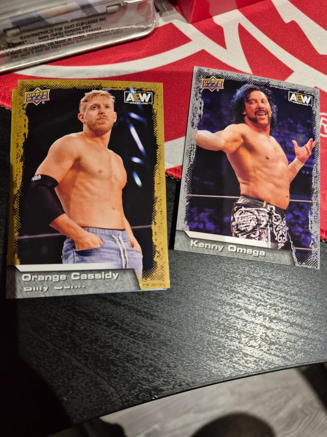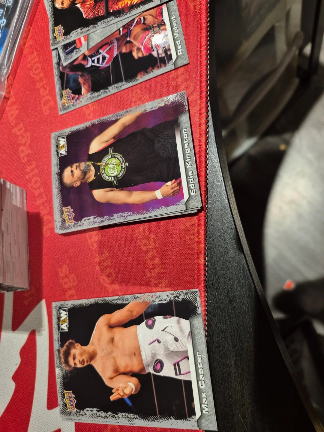 Collection of AEW Upper Deck trading cards featuring various wrestlers. Includes cards for Orange Cassidy, Kenny Omega, Eddie Kingston, Red Velvet, Matt Jade, and Luchasaurus. These are collectible cards for wrestling fans.