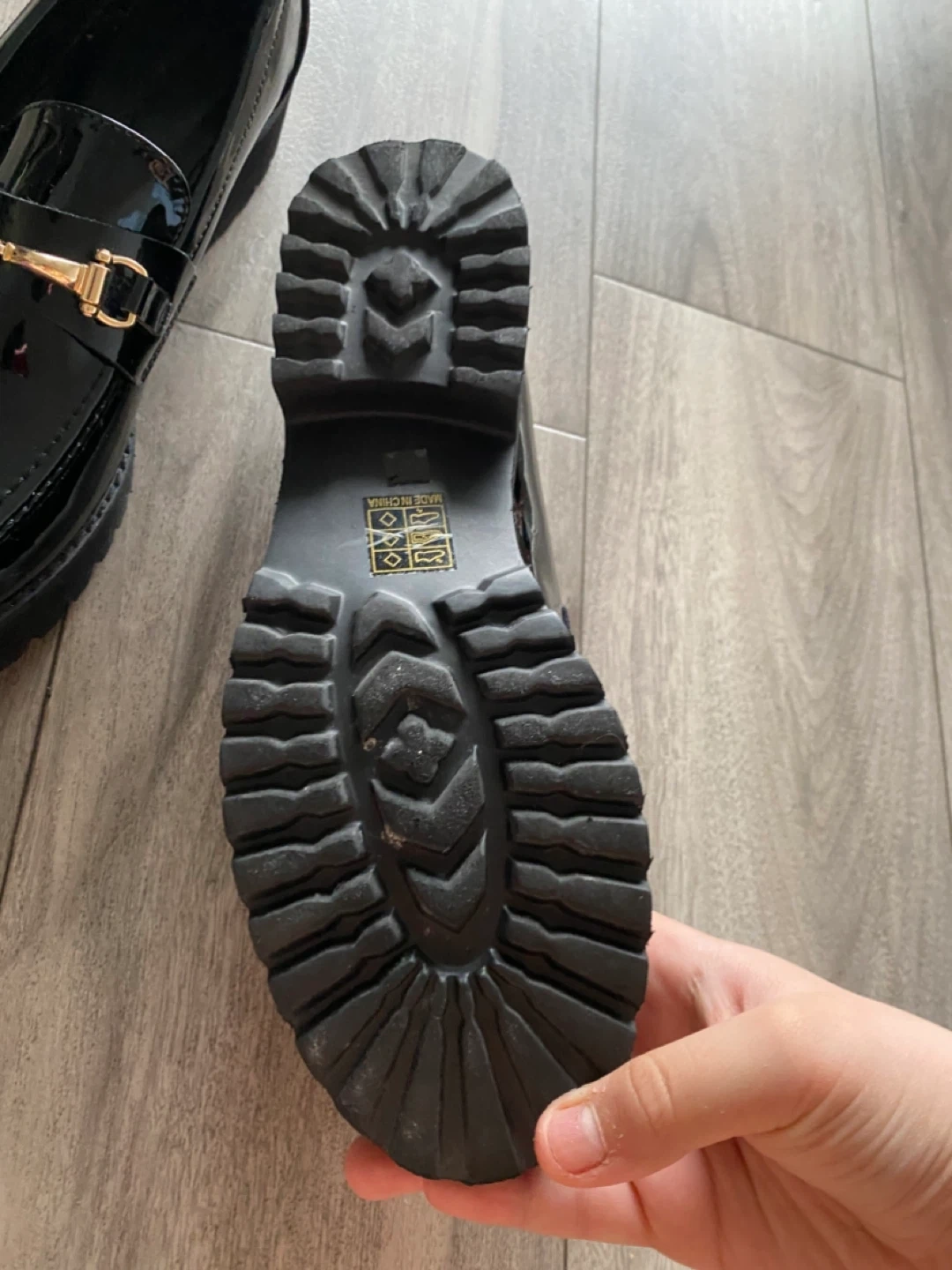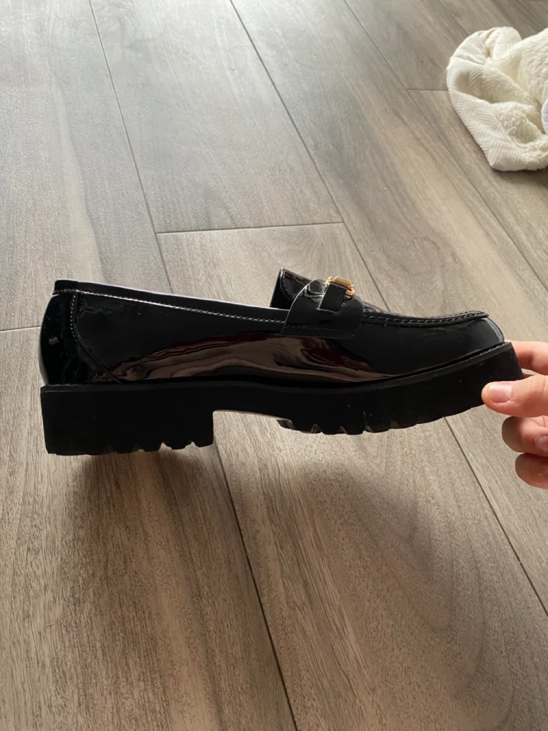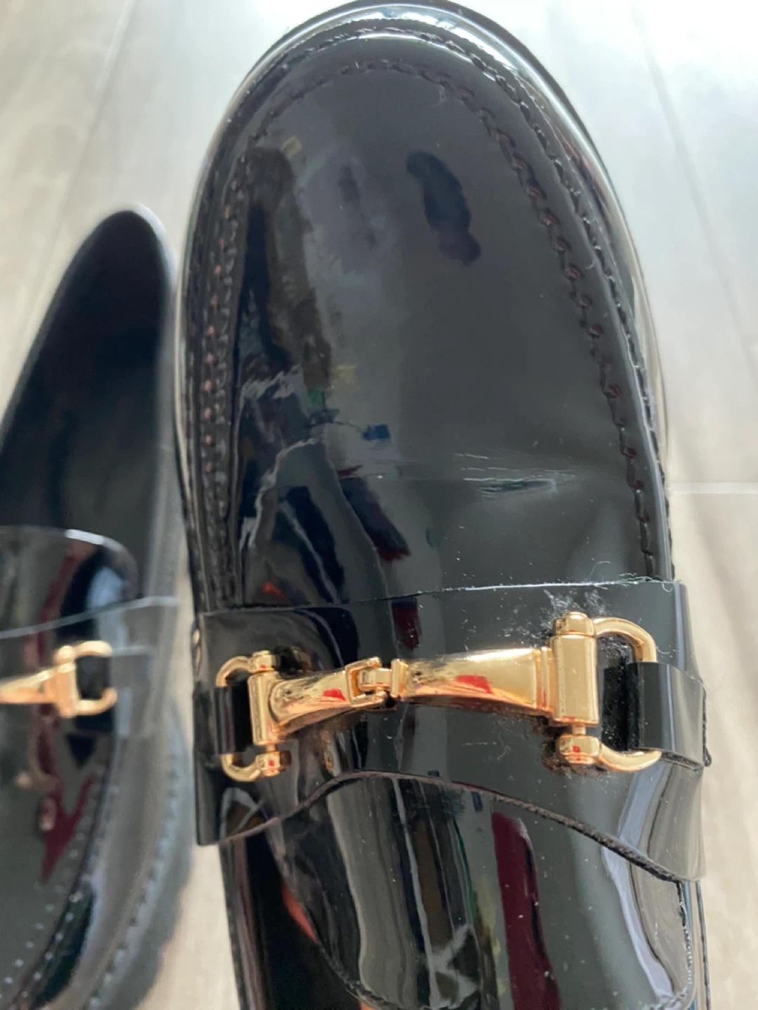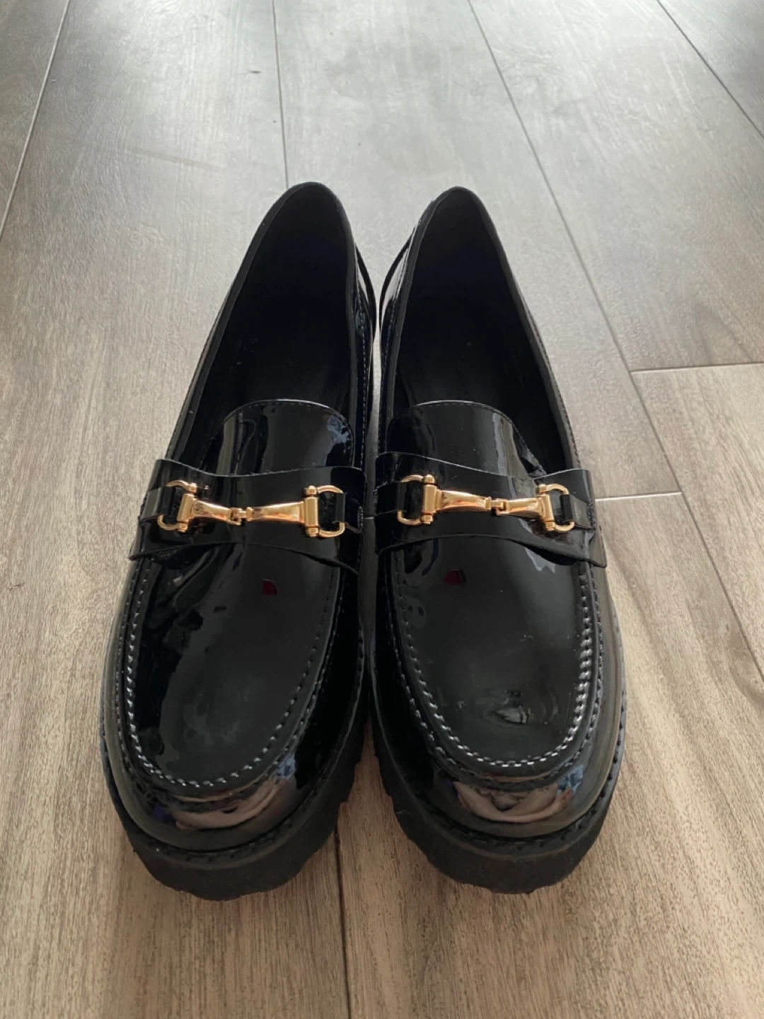 These shiny black patent loafers feature a chic gold buckle detail. They have a durable lug sole and a comfortable cushioned insole. Perfect for adding a stylish touch to any outfit!