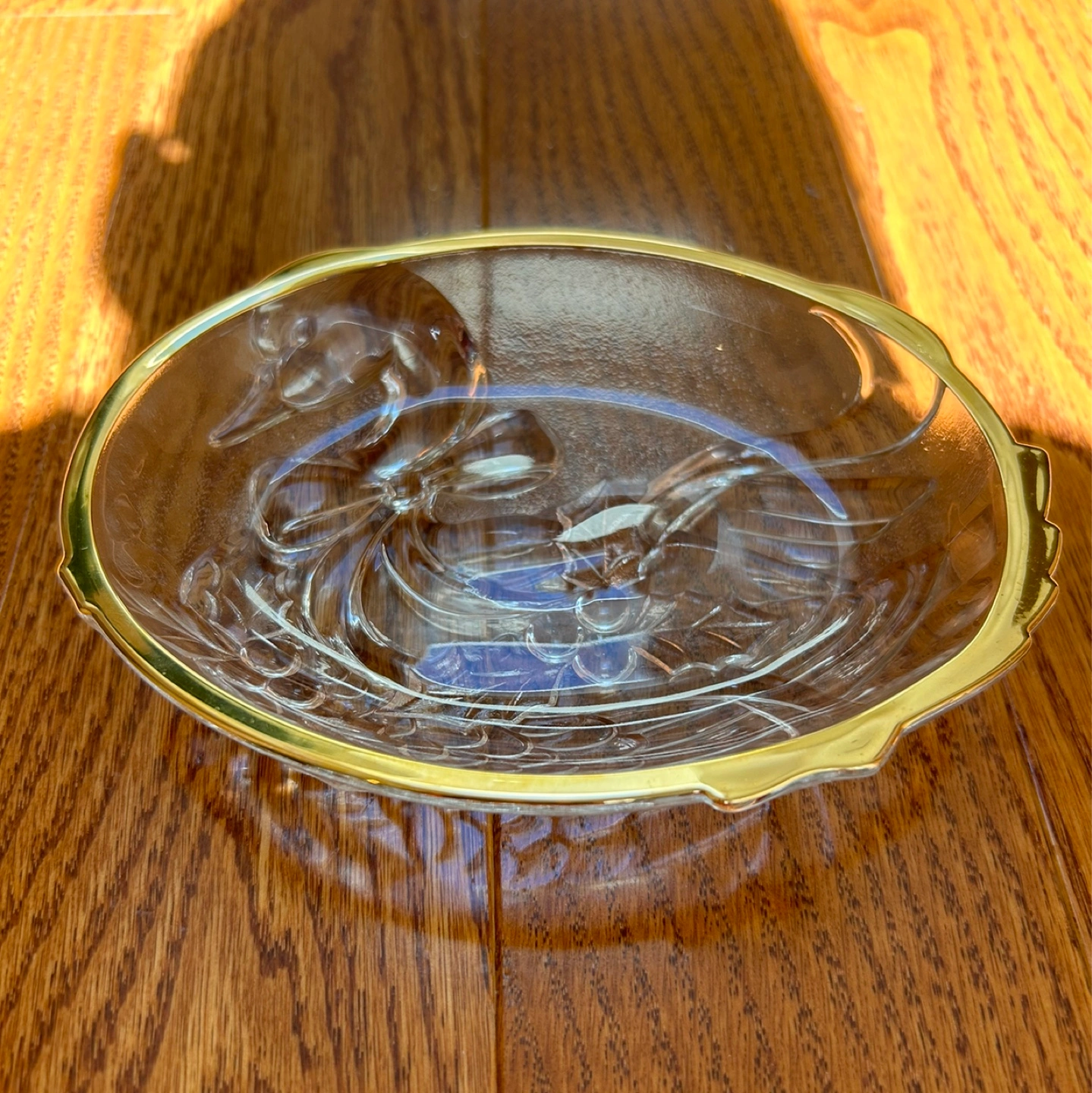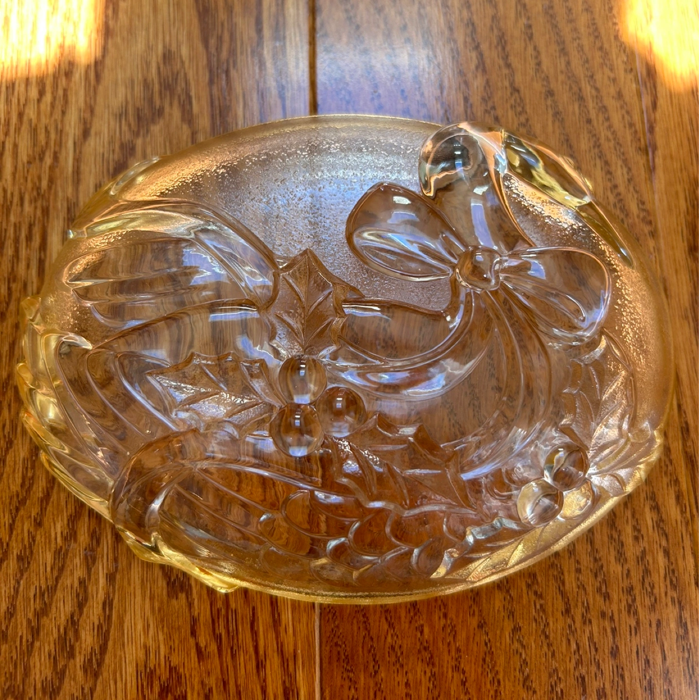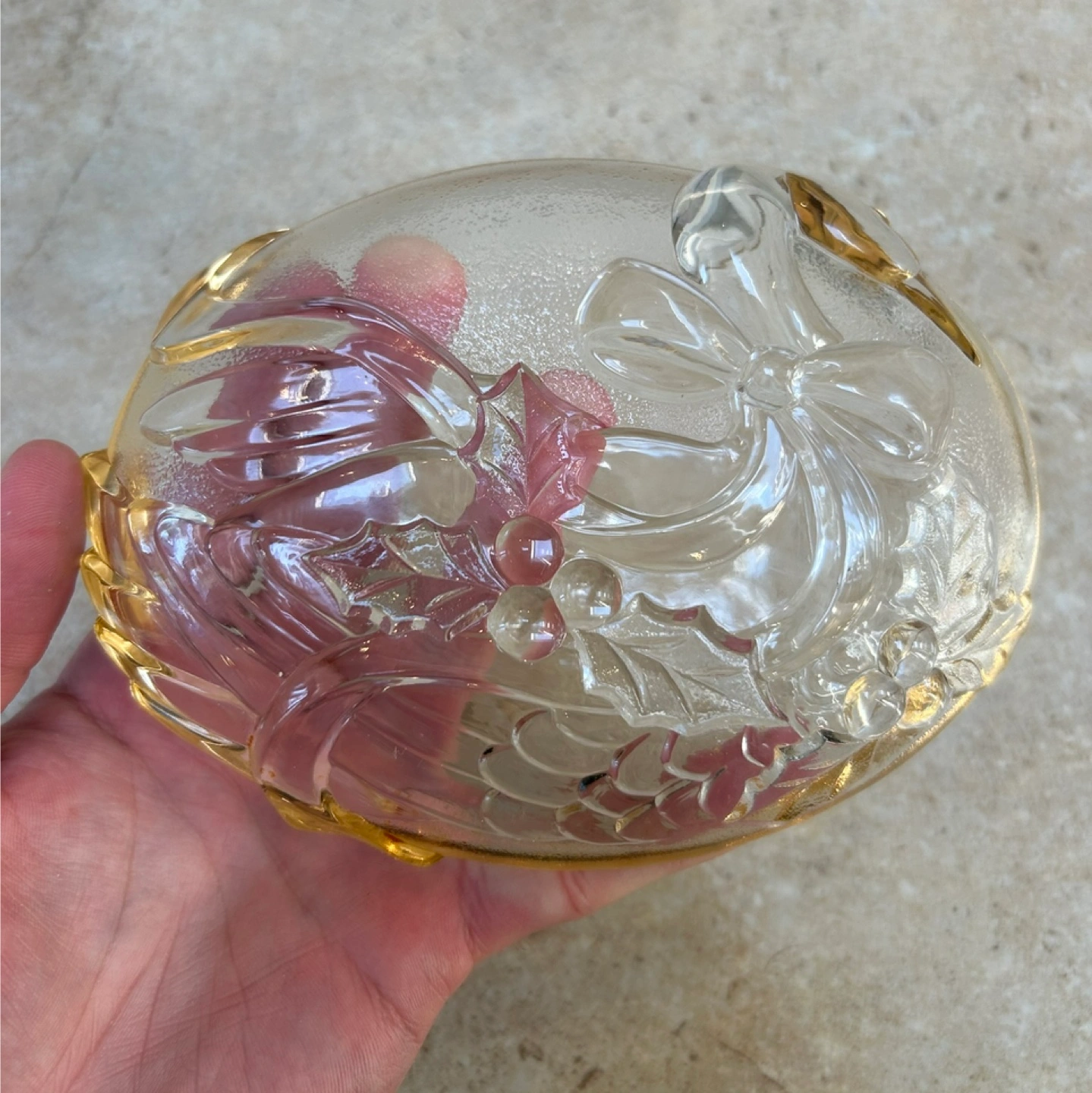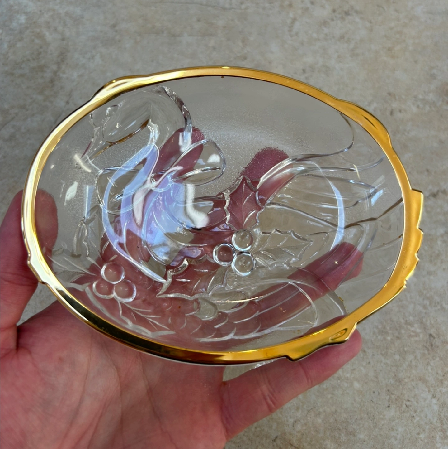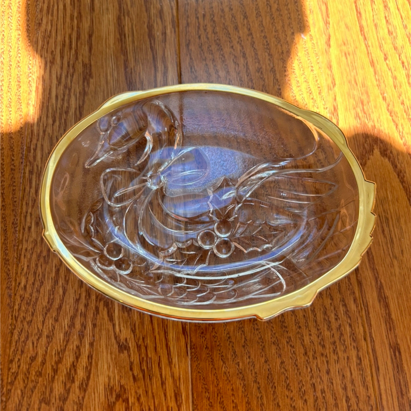 Oval-shaped glass dish. Features a carved design of a swan with a bow and holly. Gold-coloured trim around the edge. Perfect for holiday decor or candy.