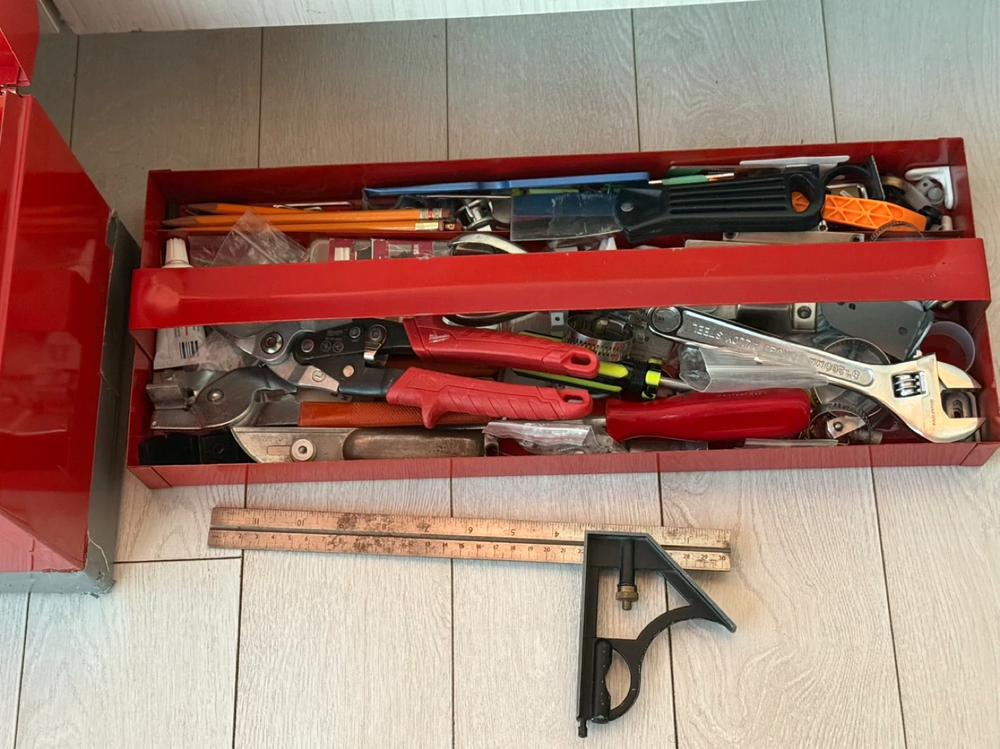 This is a used tool lot that includes a toolbox and an assortment of tools, including screwdrivers, drill bits (some in original packaging unused), Alan Keys, cutting tools with a pack of brand new blades, glass cutting tool, wrenches, pliers, wiring tools, clamps and connectors, hundreds of finishing nails and screws of all kinds and sizes, large assortment of various anchors, brackets as well as other items. These tools are ideal for various repair and maintenance tasks. Some tools have some signs of minor wear but are in good working condition. Cash accepted. Let me know if you're interested!