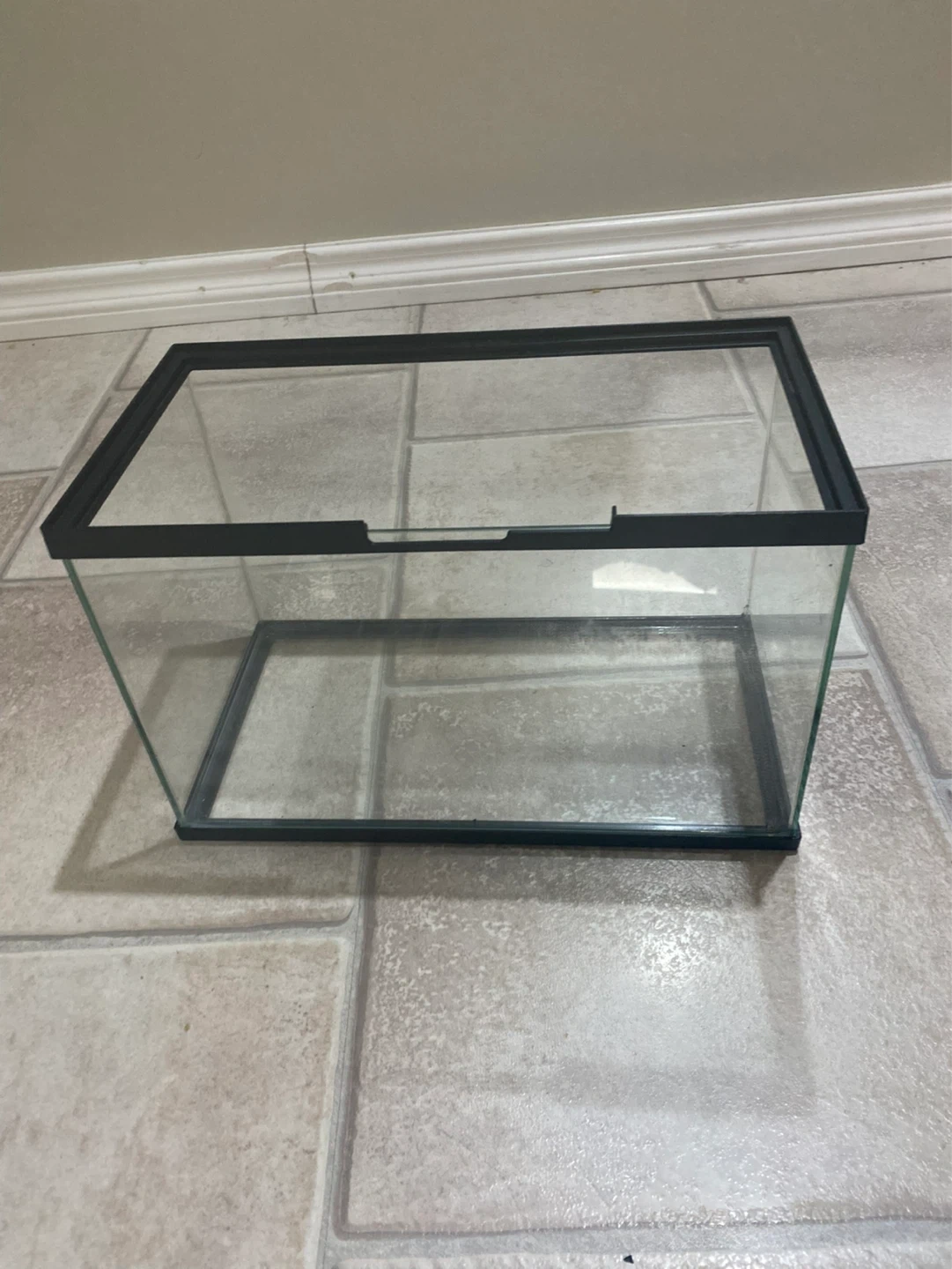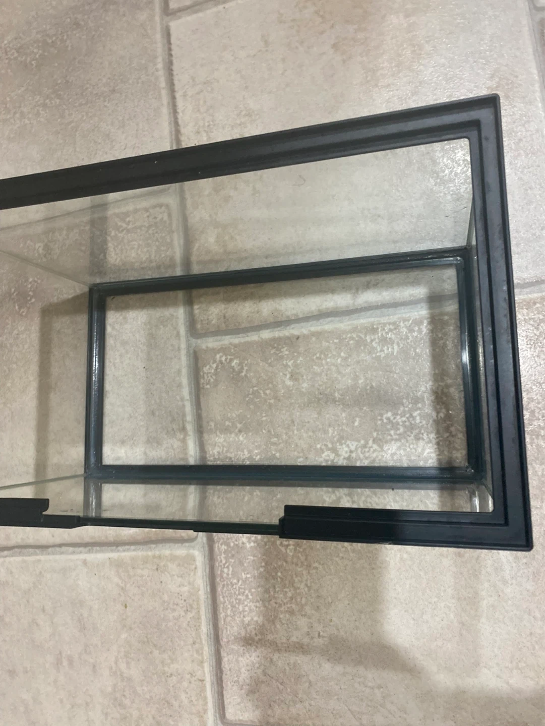 This is a glass terrarium with a black frame. It's suitable for small pets or as a starter aquarium. Tank dimensions are approximately 3 gallons.