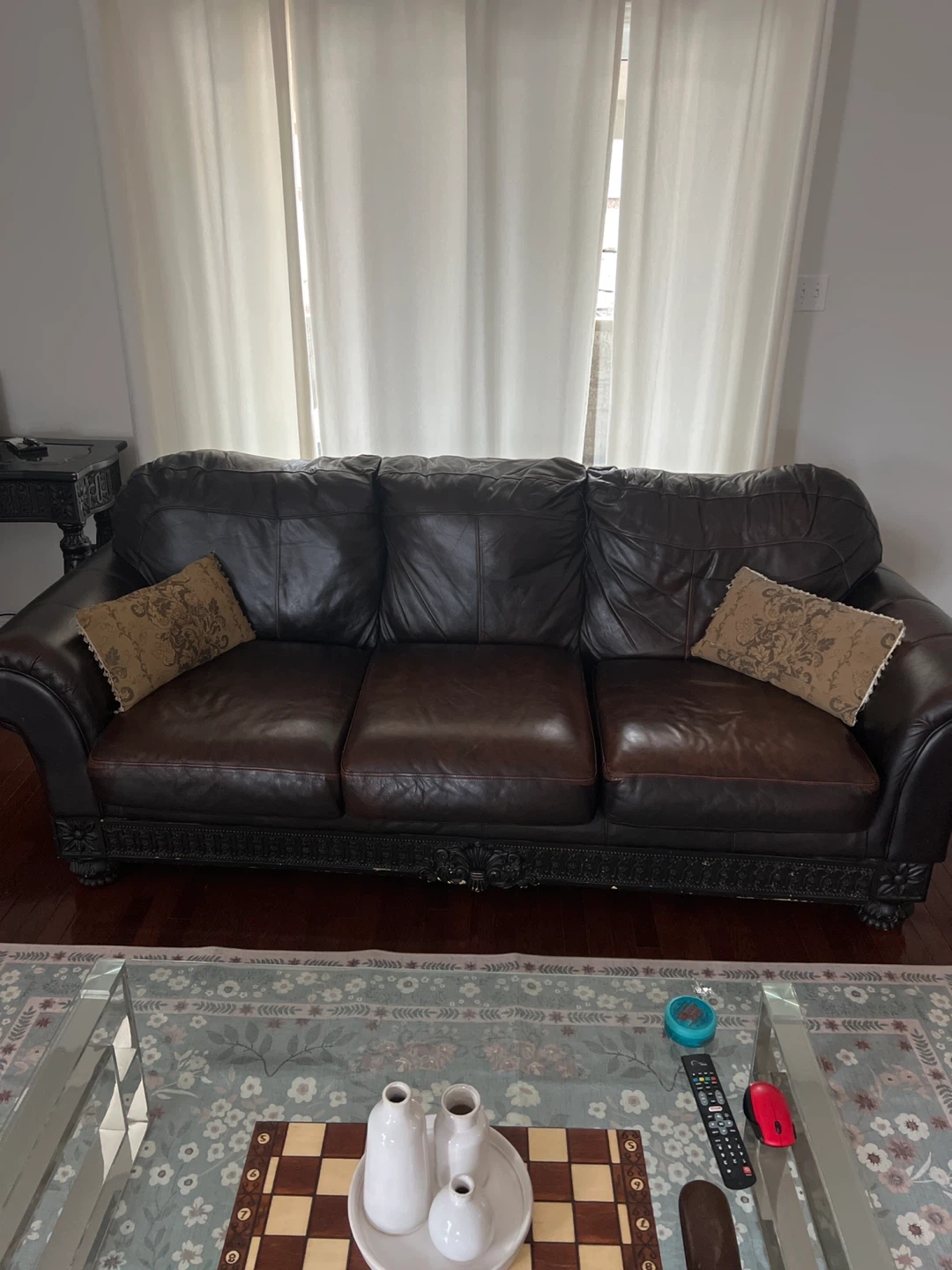 This is a classic brown leather sofa, perfect for any living room. It features a rich, dark brown upholstery and decorative carved details along the base. Includes two throw pillows with a complementary pattern. Ample seating for three people.