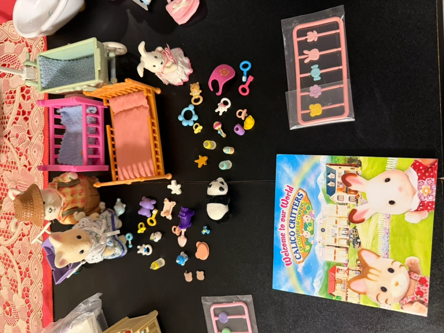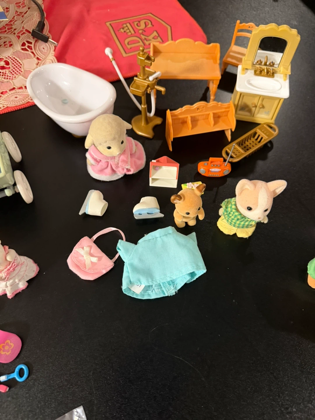 A collection of Calico Critters miniature dollhouse furniture and animal figures. Includes various accessories and furniture pieces for imaginative play. Perfect for collectors or for kids to create their own stories!