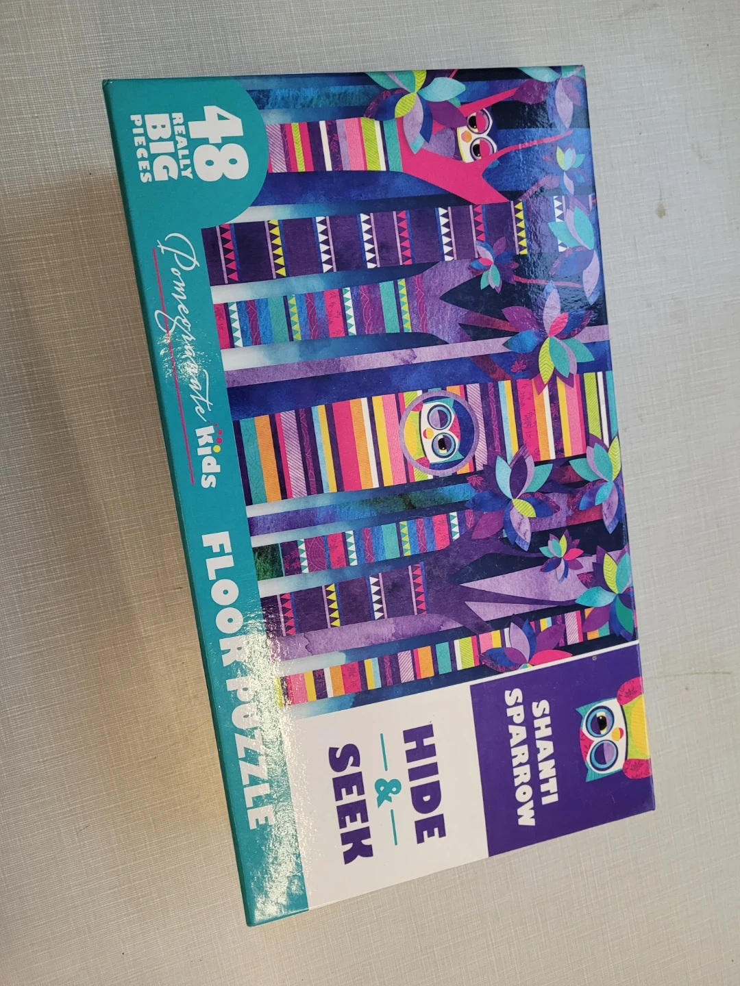 Looking to sell this Shanti Sparrow Hide & Seek Floor Puzzle. It's from Pomegranate Kids and includes 48 really big pieces, perfect for little hands! The puzzle size is 36 x 24 inches (91.4 x 61 cm). It features colourful illustrations by Shanti Sparrow, inspired by nature and storytelling
