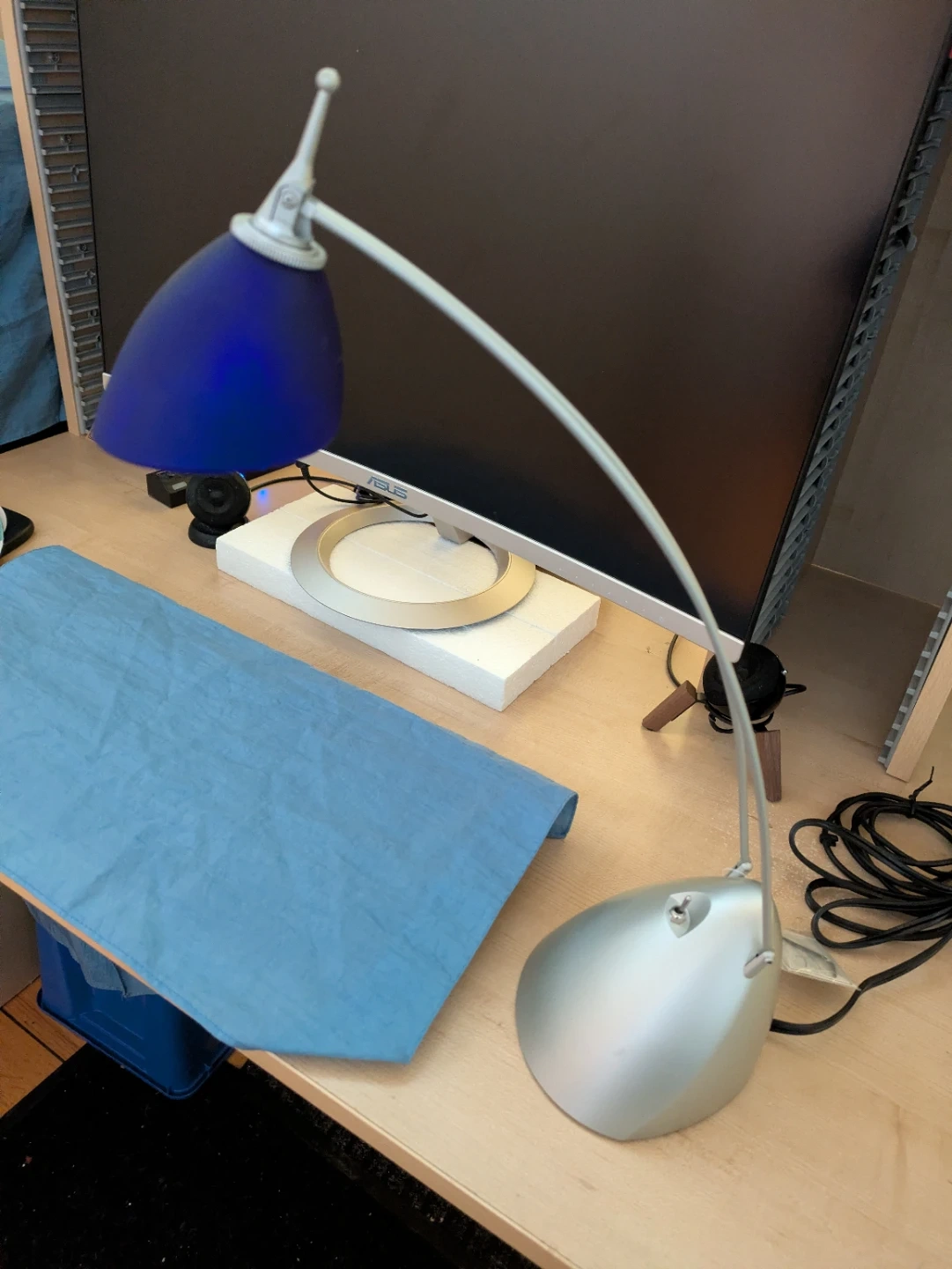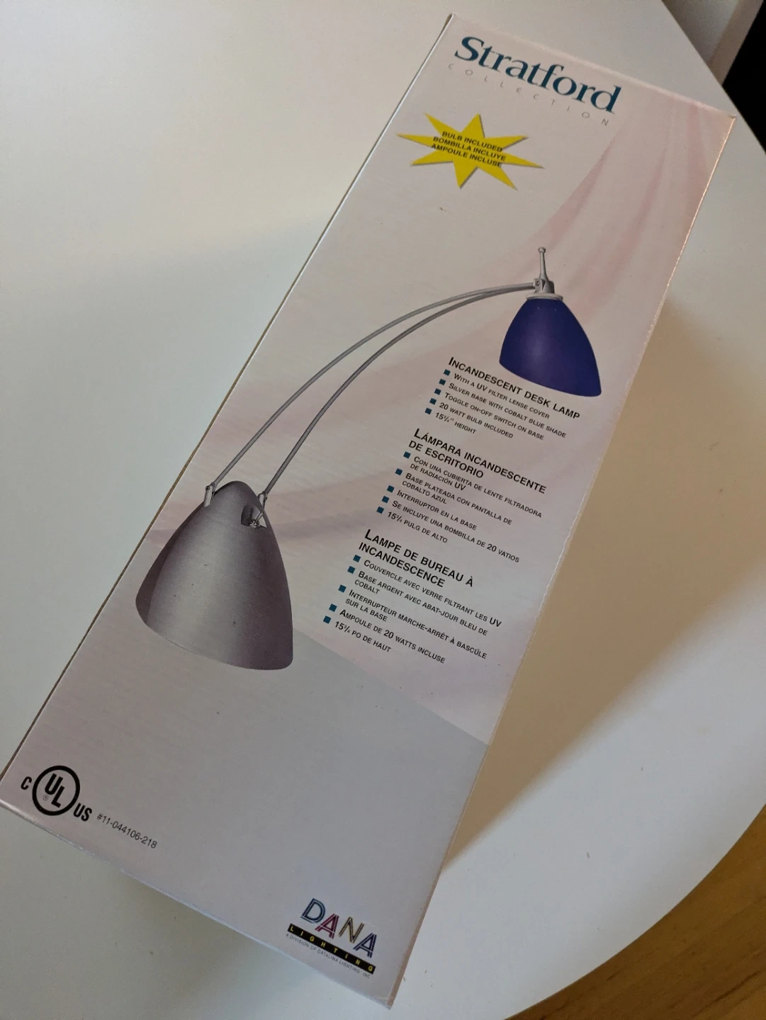 Selling a Stratford Collection Incandescent Desk Lamp. It features a UV filter with a cobalt blue shade and a rocker on/off switch on the base. It also includes light bulb. Comes with the original box!