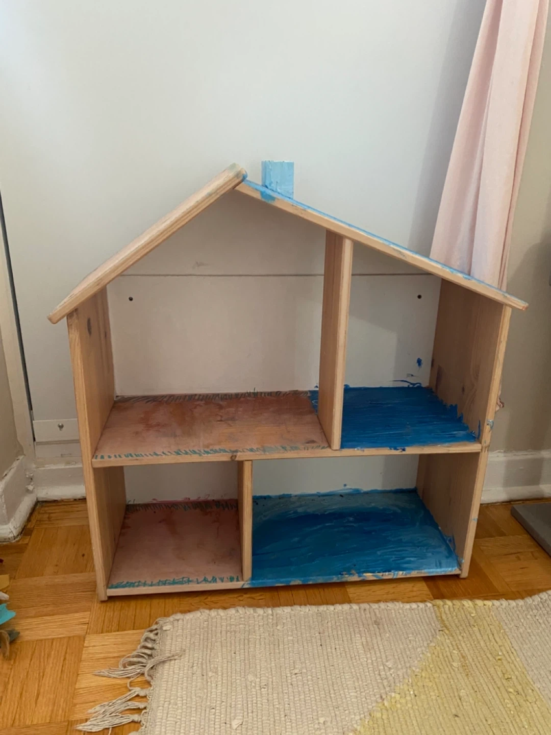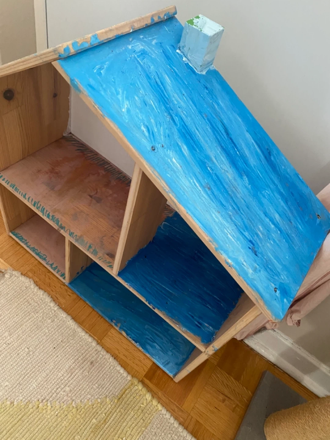 The only thing is that it has drawings and paint all over so you’d want to sand it and repaint it. The stains that look like water damage aren’t that; that’s just spread out watercolour paint (the wood isn’t damaged).