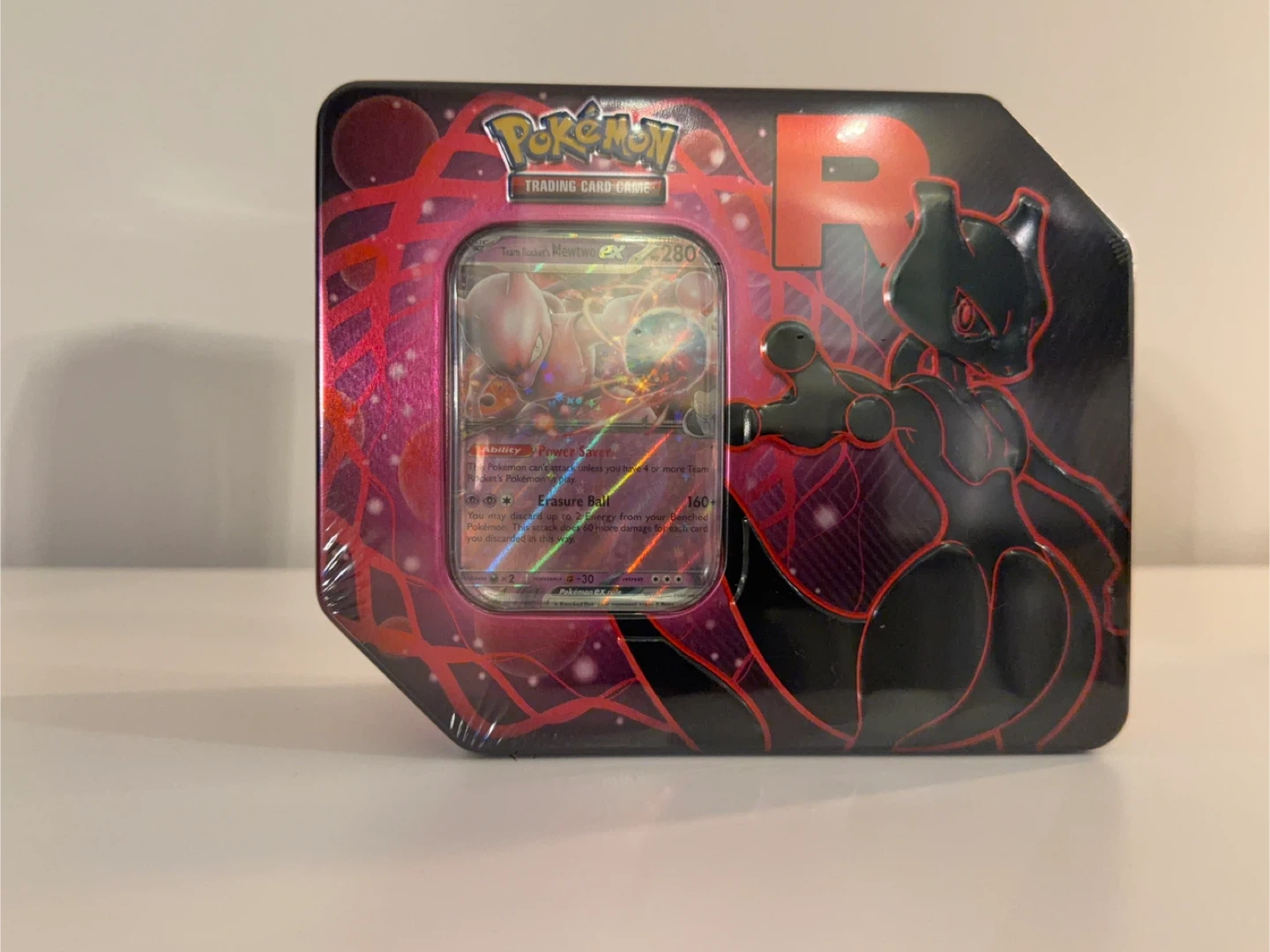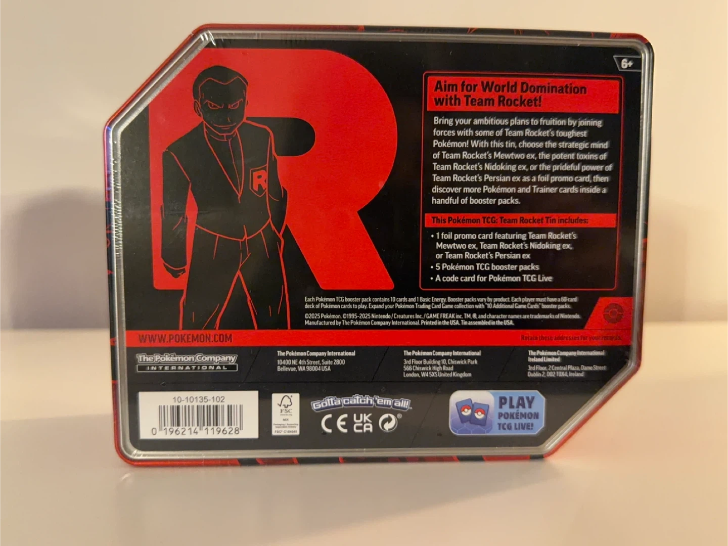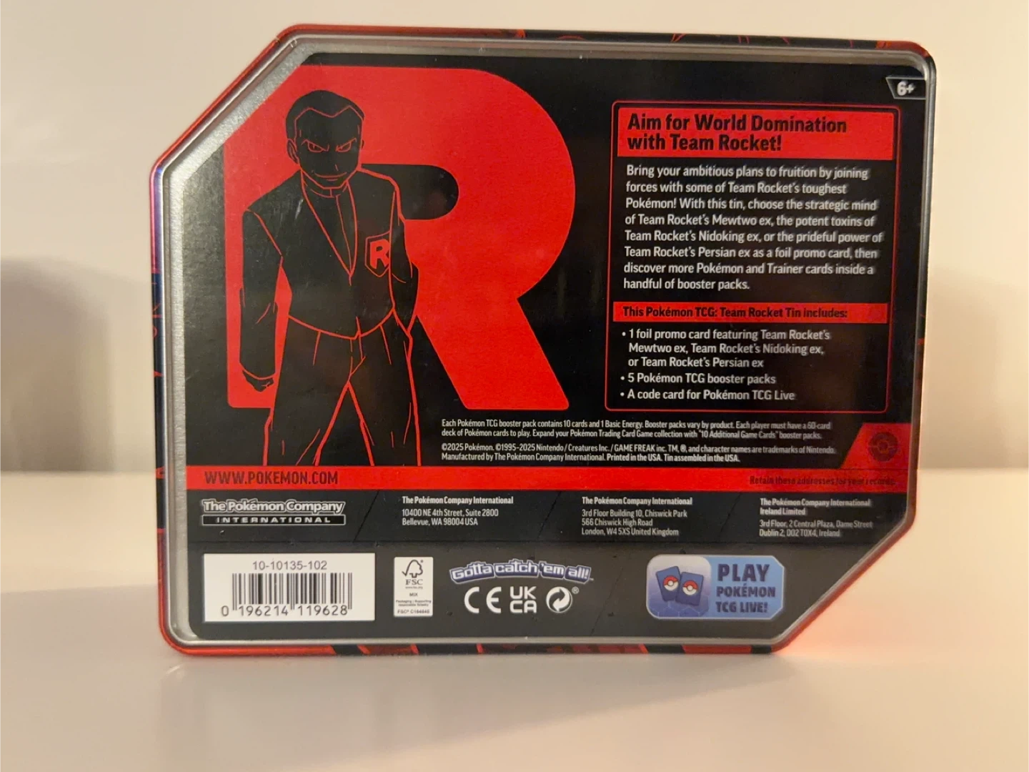 Set of 3 sealed Pokémon Trading Card Game Team Rocket tins featuring Team Rocket’s Mewtwo ex, Team Rocket’s Nidoking ex, and Team Rocket’s Persian ex promo cards. Each tin is factory sealed and includes 5 Pokémon TCG booster packs plus a code card for Pokémon TCG Live. Great for collectors, sealed product investors, or anyone looking to chase Team Rocket cards.