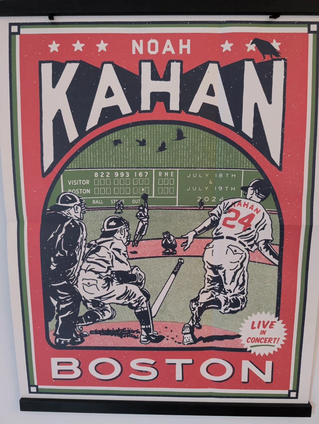 This is a Noah Kahan live in concert poster for Boston. It advertises shows on July 18th & 19th, 2024. The poster features a baseball theme and includes the 'Live in Concert!' callout. It's a unique piece for fans!