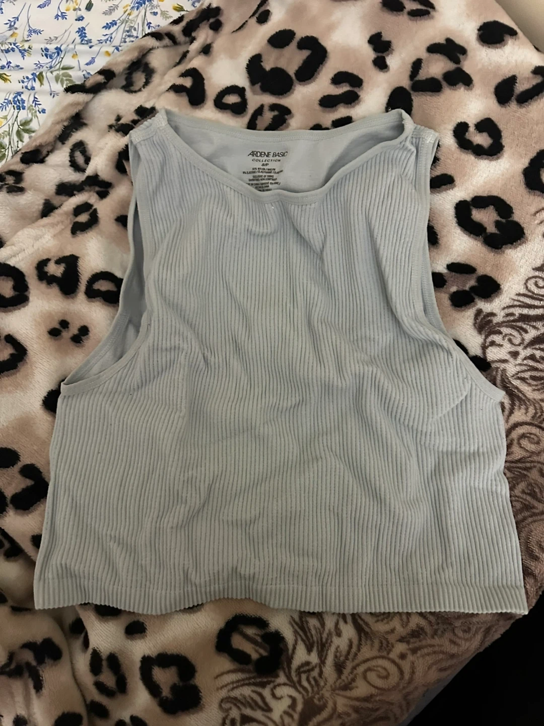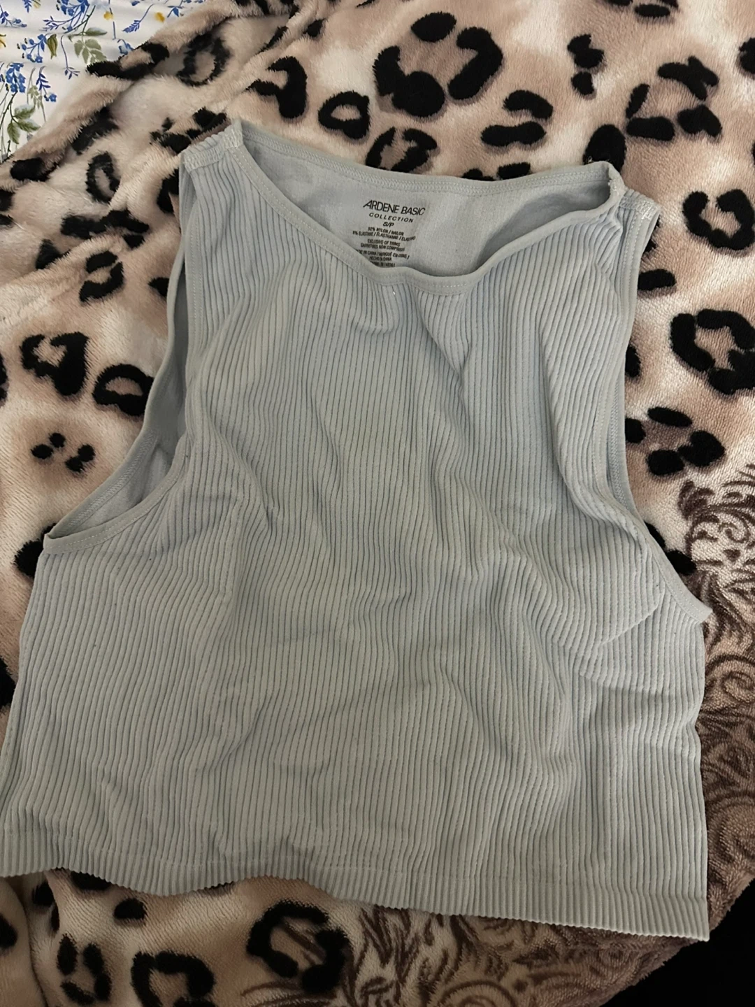 A light blue ribbed tank top from Ardene Basic. It's a sleeveless V-neck style. Great for layering or wearing on its own during warmer weather!