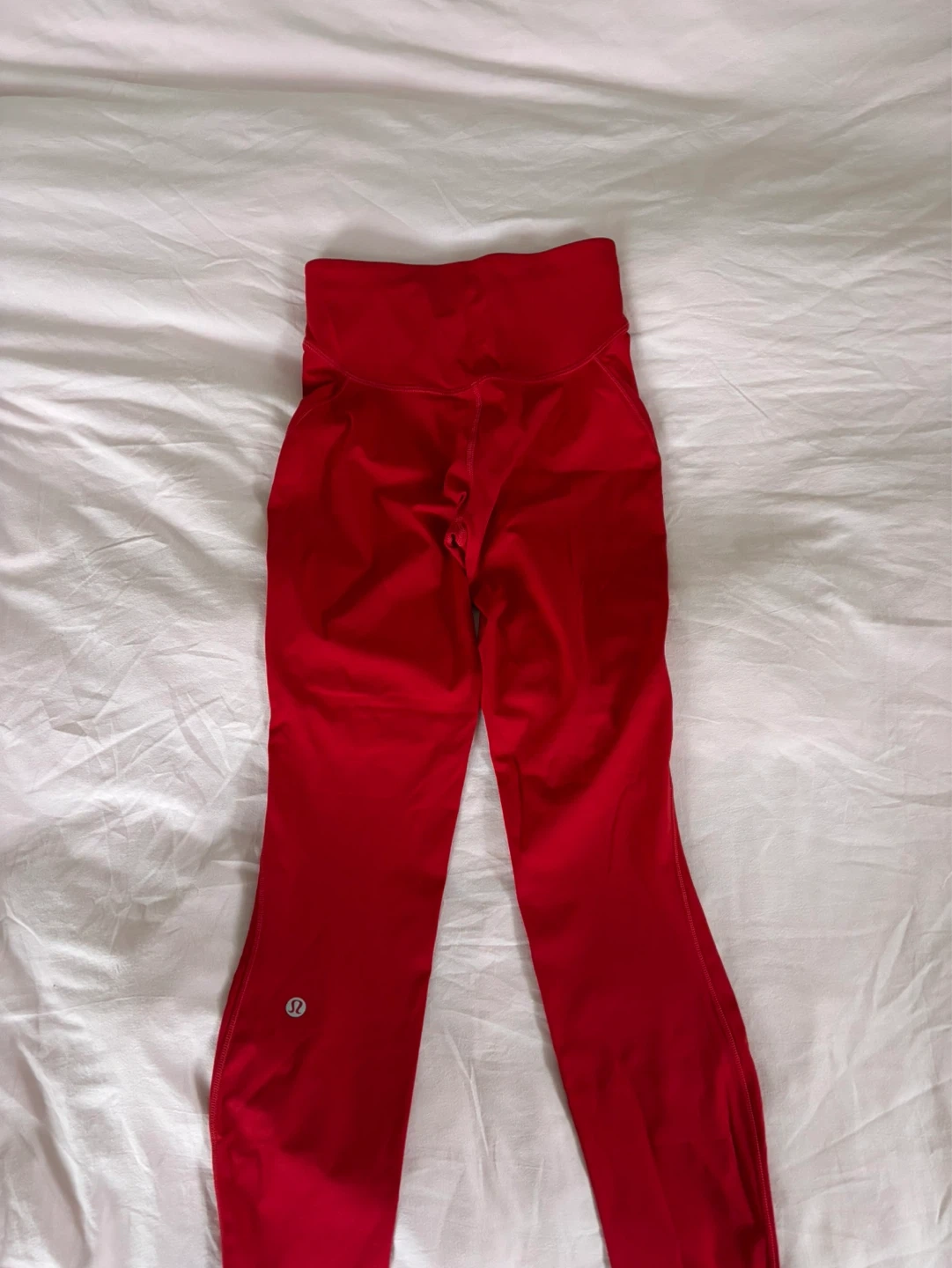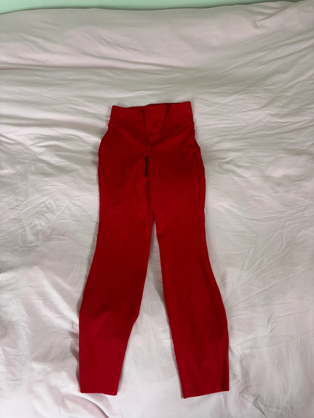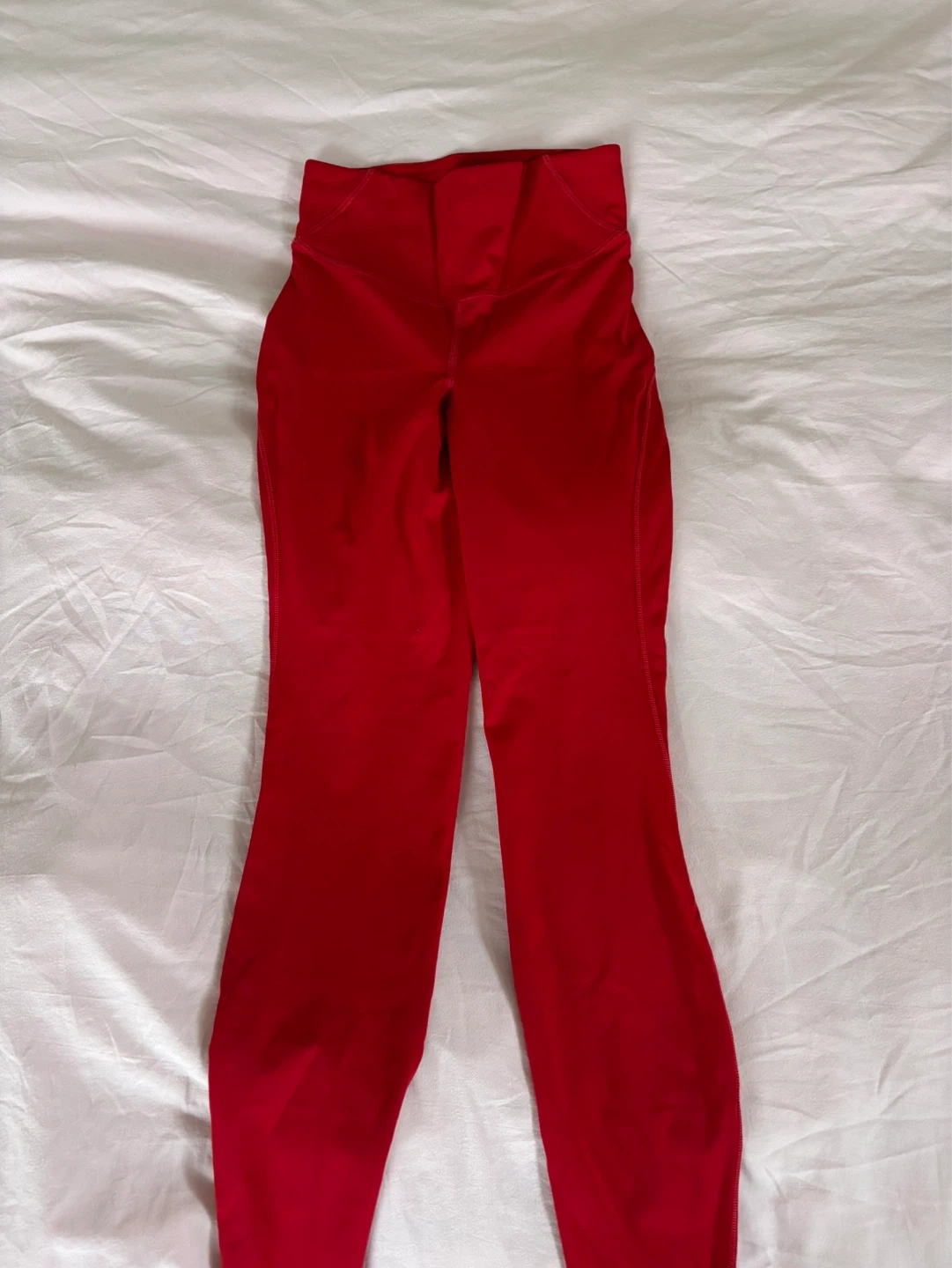 These are Lululemon Align leggings in a vibrant red colour. They're size 6 and made from a soft, buttery fabric. Perfect for yoga or everyday wear!