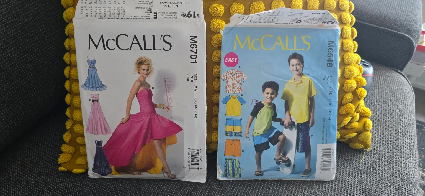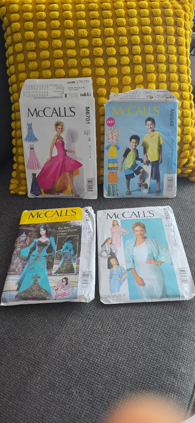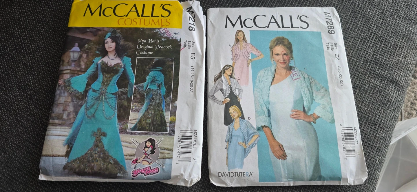 A collection of McCall's sewing patterns for various garments. Includes costume patterns like the "Yaya Han Original Peacock Costume" and dresses. Also features patterns for children's tops, shorts, and pants. Sizes vary from A5 to ZZ.