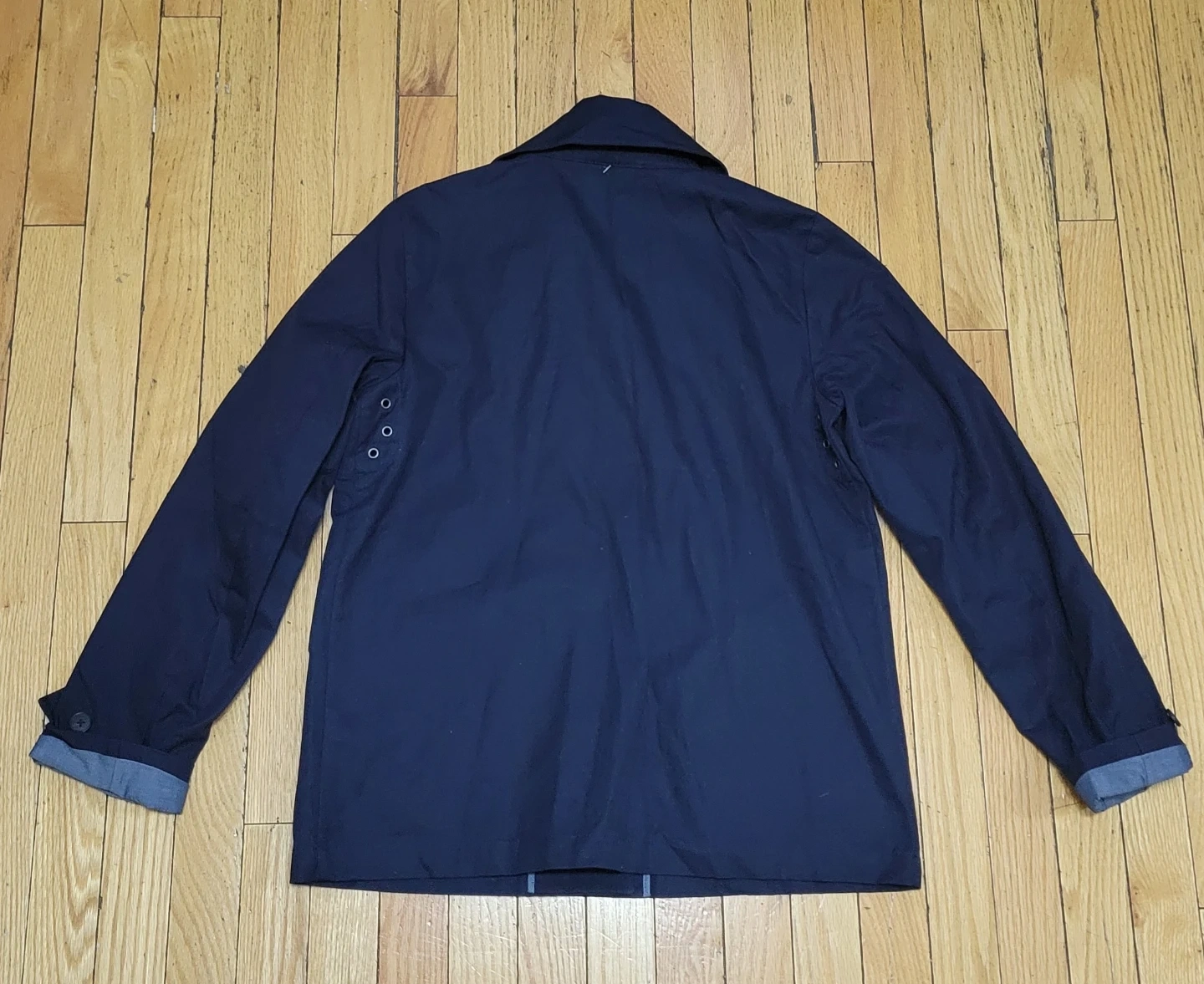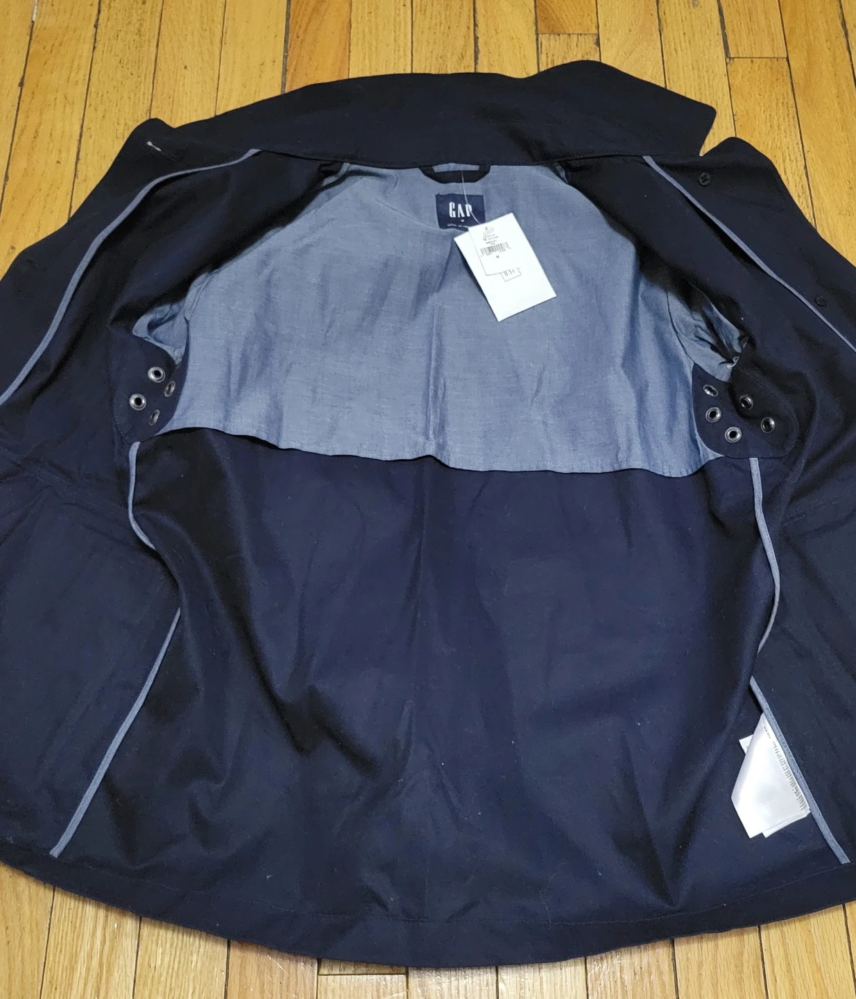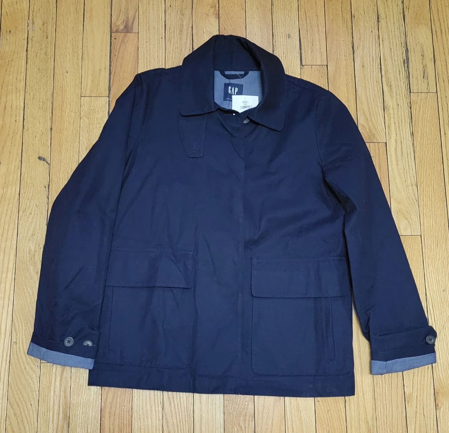 This is a men's navy jacket from GAP. It's made with a cotton blend. US/GB: M. Shell: 65% polyester, 35% cotton. Lining: 100% cotton. It's a versatile jacket for everyday wear.