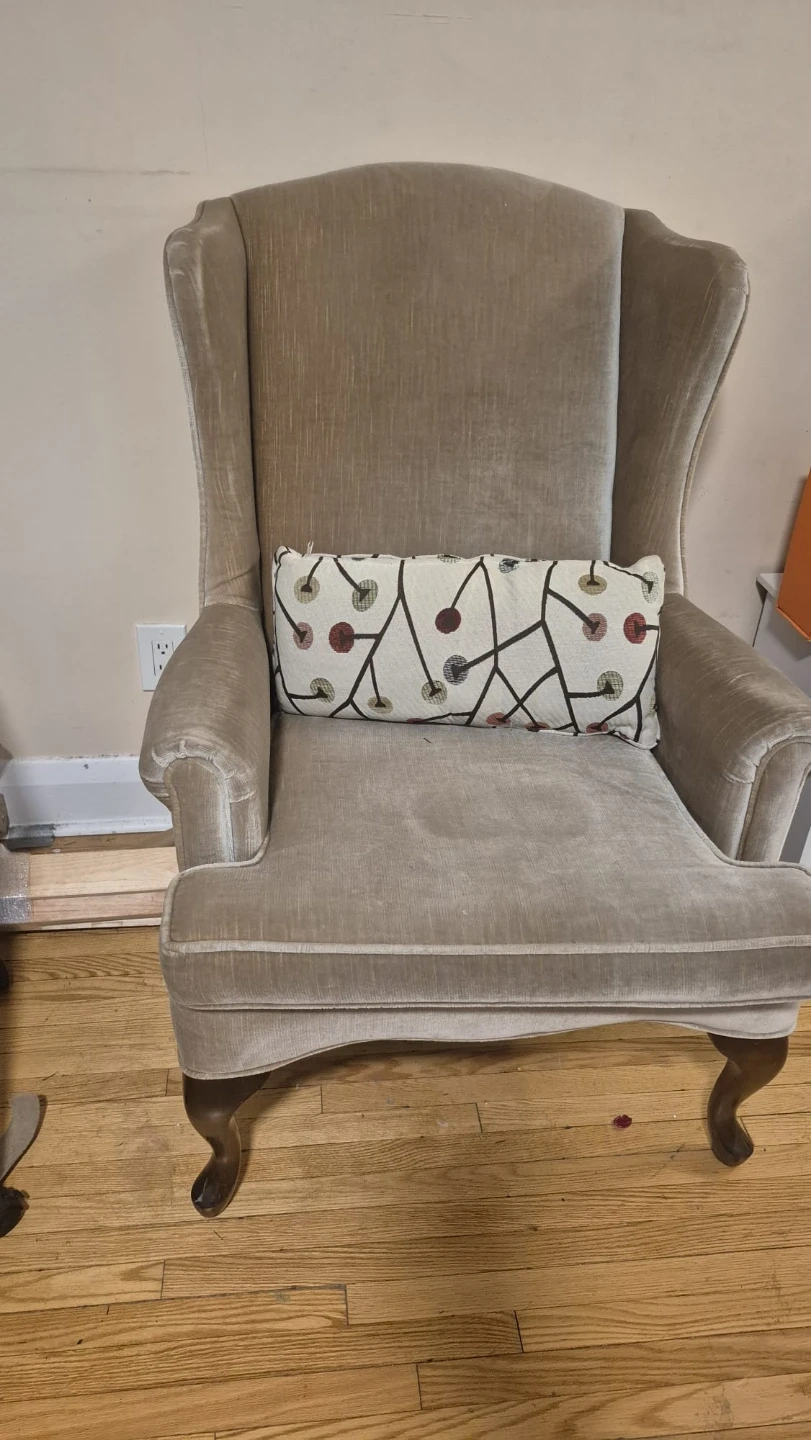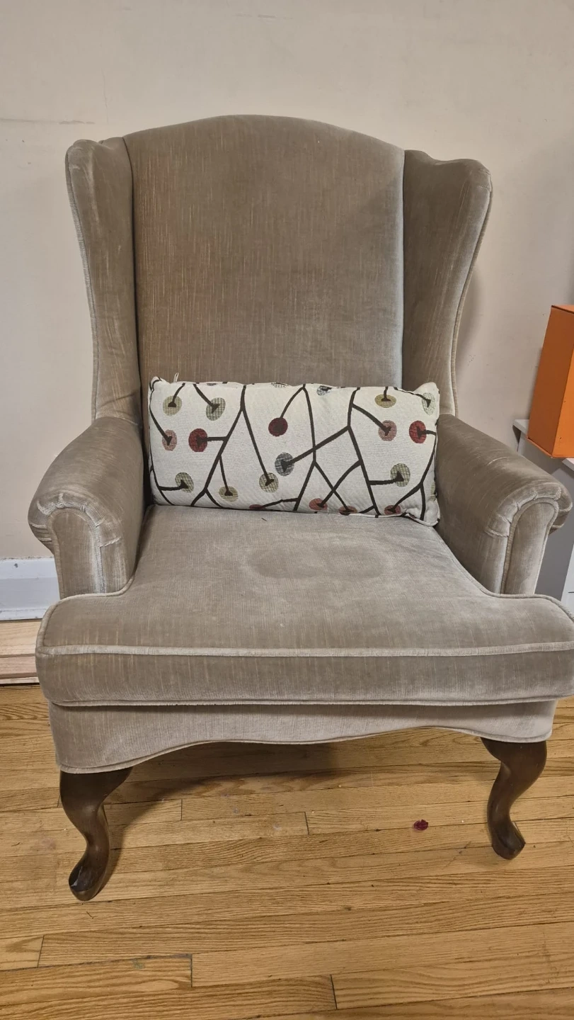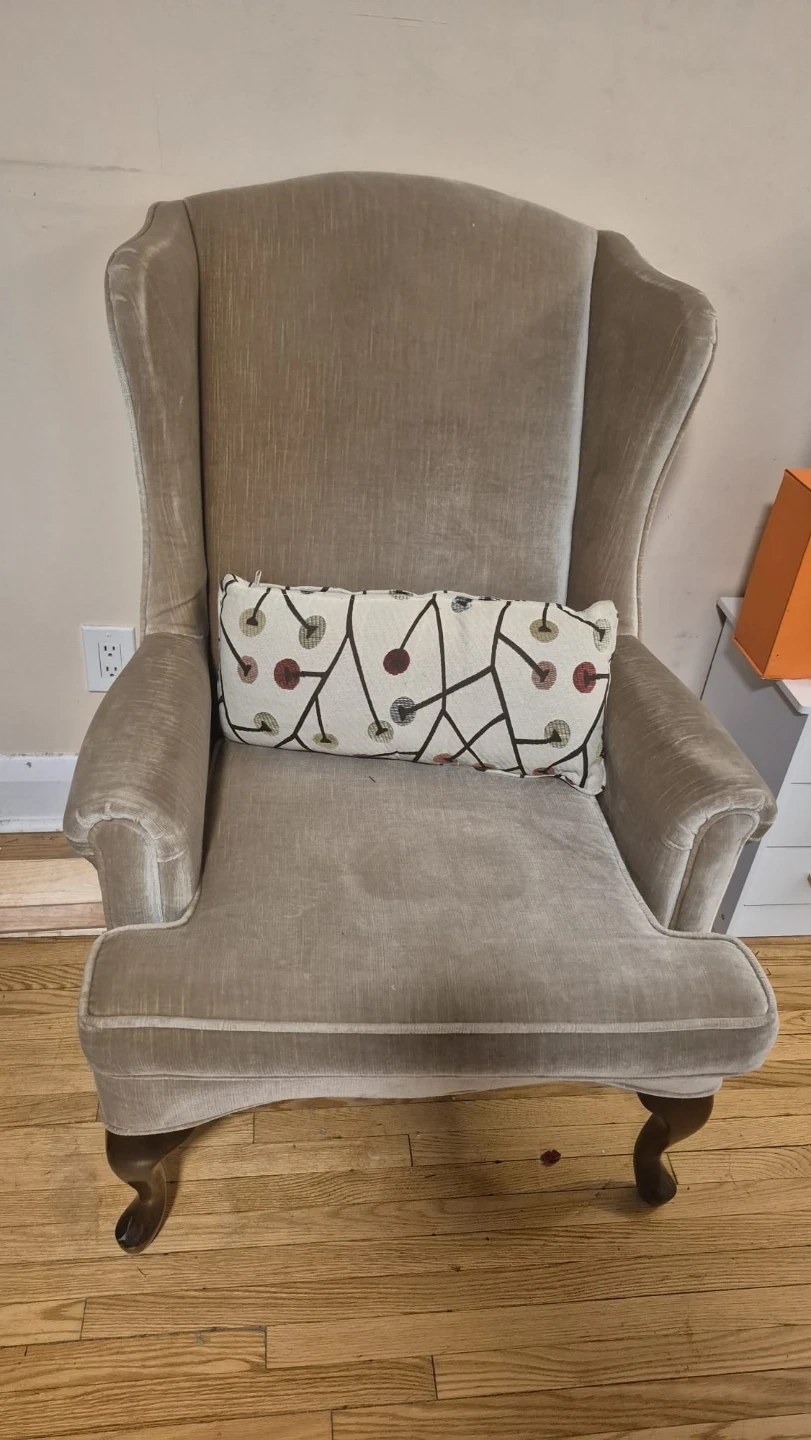 Comfortable beige wingback armchair in good condition. Perfect for adding a touch of elegance to any room! It's sturdy and has a classic design. Comes with pillow