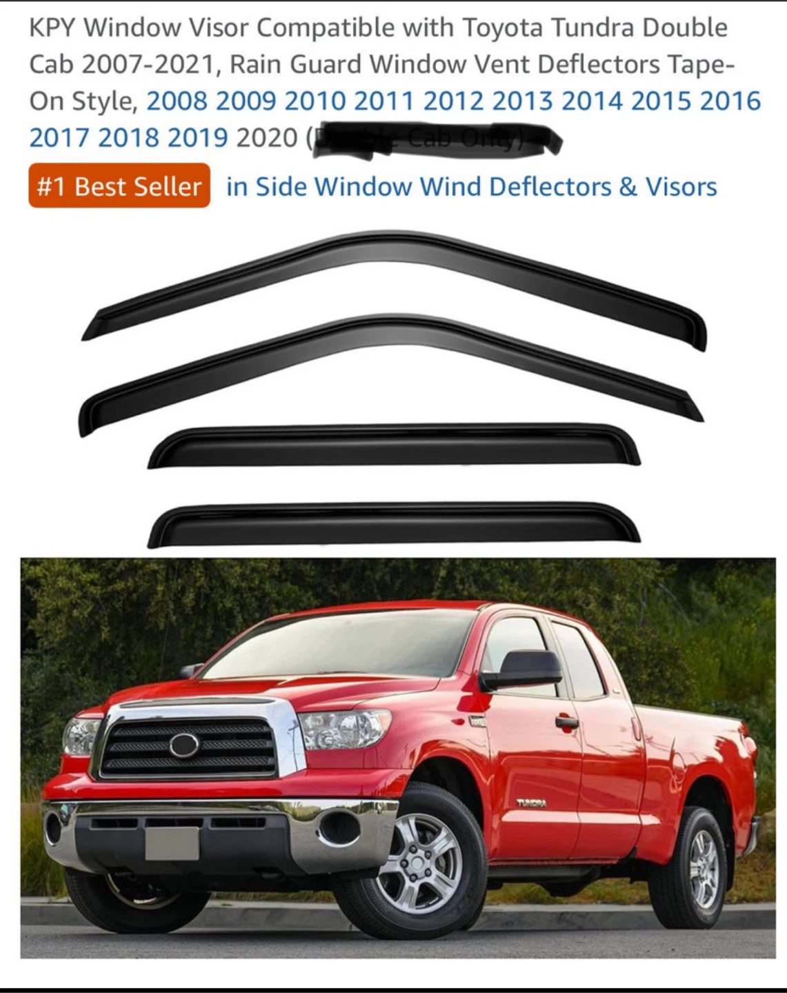 Selling a set of KPY window visors compatible with Toyota Tundra Crew Cab models from 2007 to 2021. These rain guards and window vent deflectors attach with tape for easy installation. They're a #1 Best Seller in Side Window Wind Deflectors & Visors