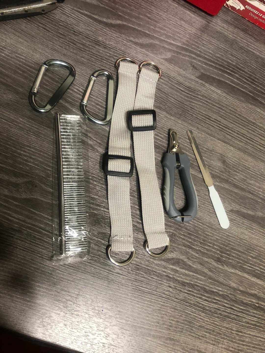 Selling a dog grooming kit with everything you need to keep your furry friend looking their best! The kit includes nail clippers, a comb, straps, and carabiners. Perfect for at-home grooming sessions!