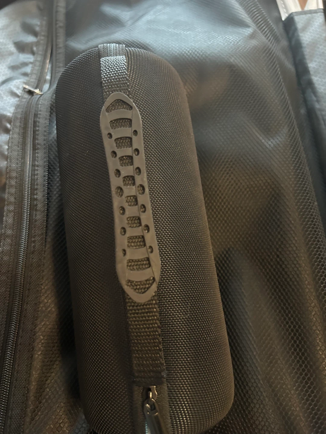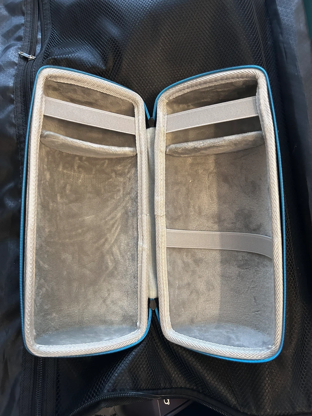 Selling a black protective carrying case. It appears to be in great condition and has a handle for easy carrying. The inside is lined with a soft, grey material and has elastic straps to hold items in place. Perfect for protecting delicate items while travelling or storing them at home