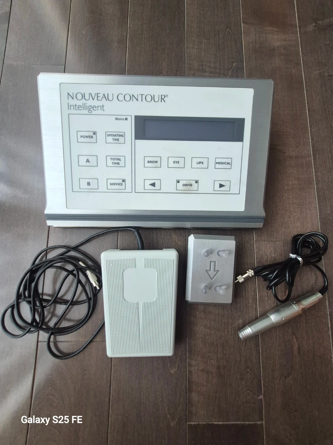 This is a Nouveau Contour Intelligent permanent makeup machine. It includes the main unit, a foot pedal, and a handpiece. Buttons are for power, operating time, total time, service, brow, eye, lips, and medical applications.
