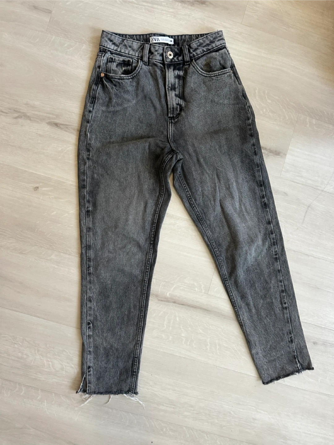 ZARA mom jeans in a grey wash. They're made of denim with a high waist. They have a button and zip fly closure.