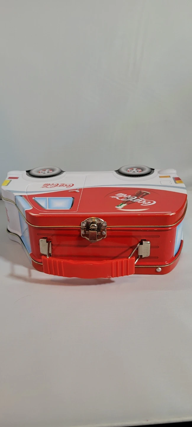 Coca-Cola branded tin box designed to look like a vintage van. It has a red and white exterior with the classic Coca-Cola logo. Metal construction with a handle on top for carrying.