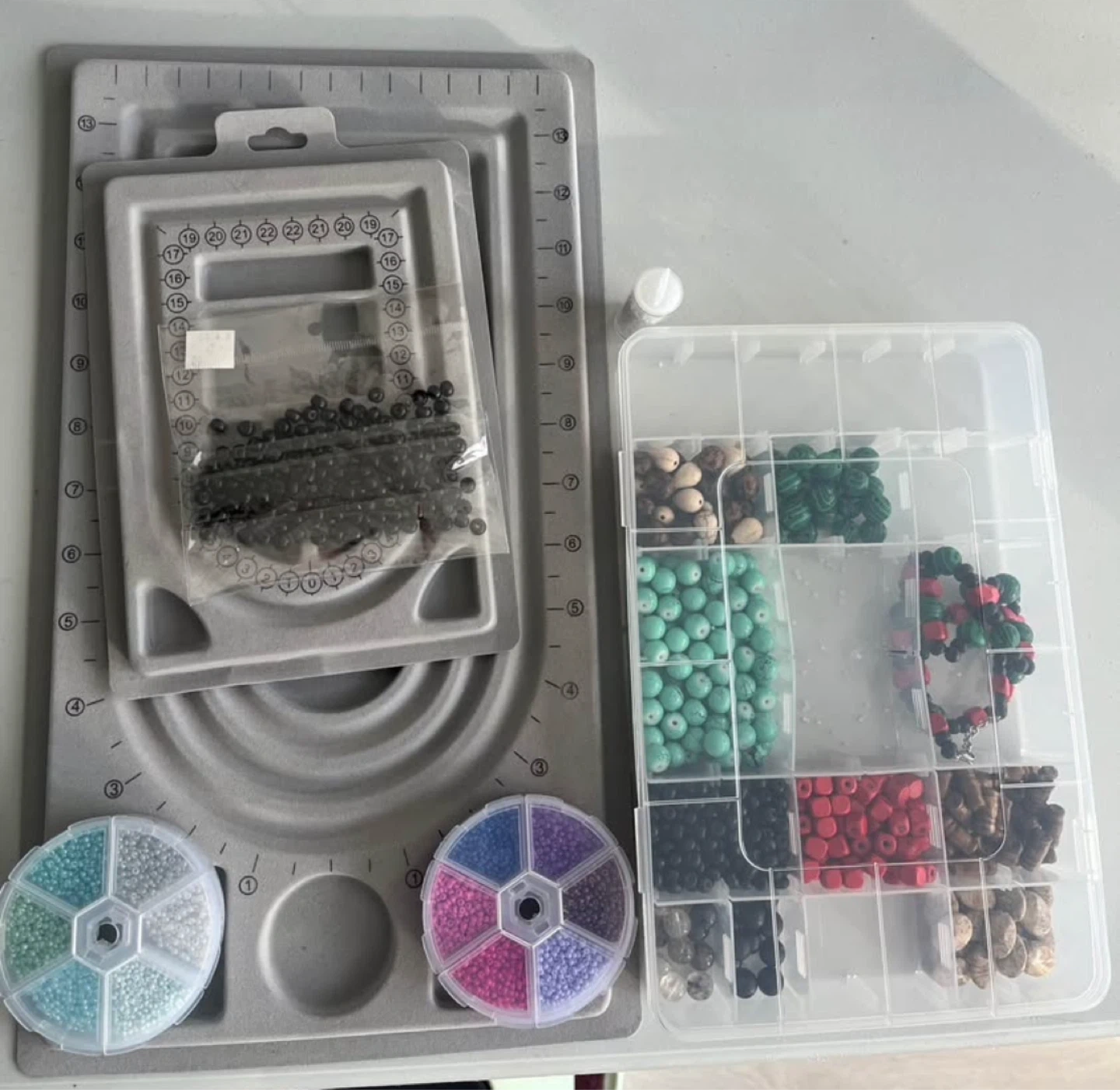 This set includes a bead design board, a storage organizer, and a variety of beads in different colours and materials. It also comes with small containers of seed beads. This kit is suitable for anyone looking to get into jewellery making or craft projects.