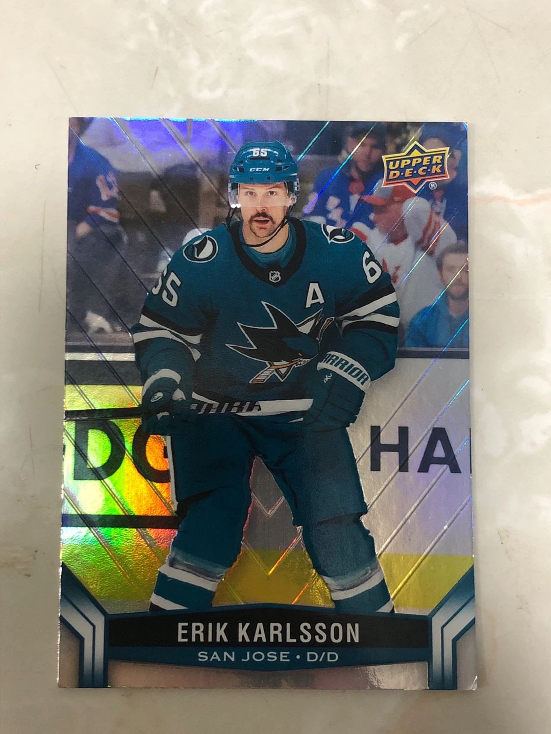 This is an Upper Deck hockey card featuring Erik Karlsson. It's a card for collectors or fans of the San Jose Sharks. The card's design is holographic.