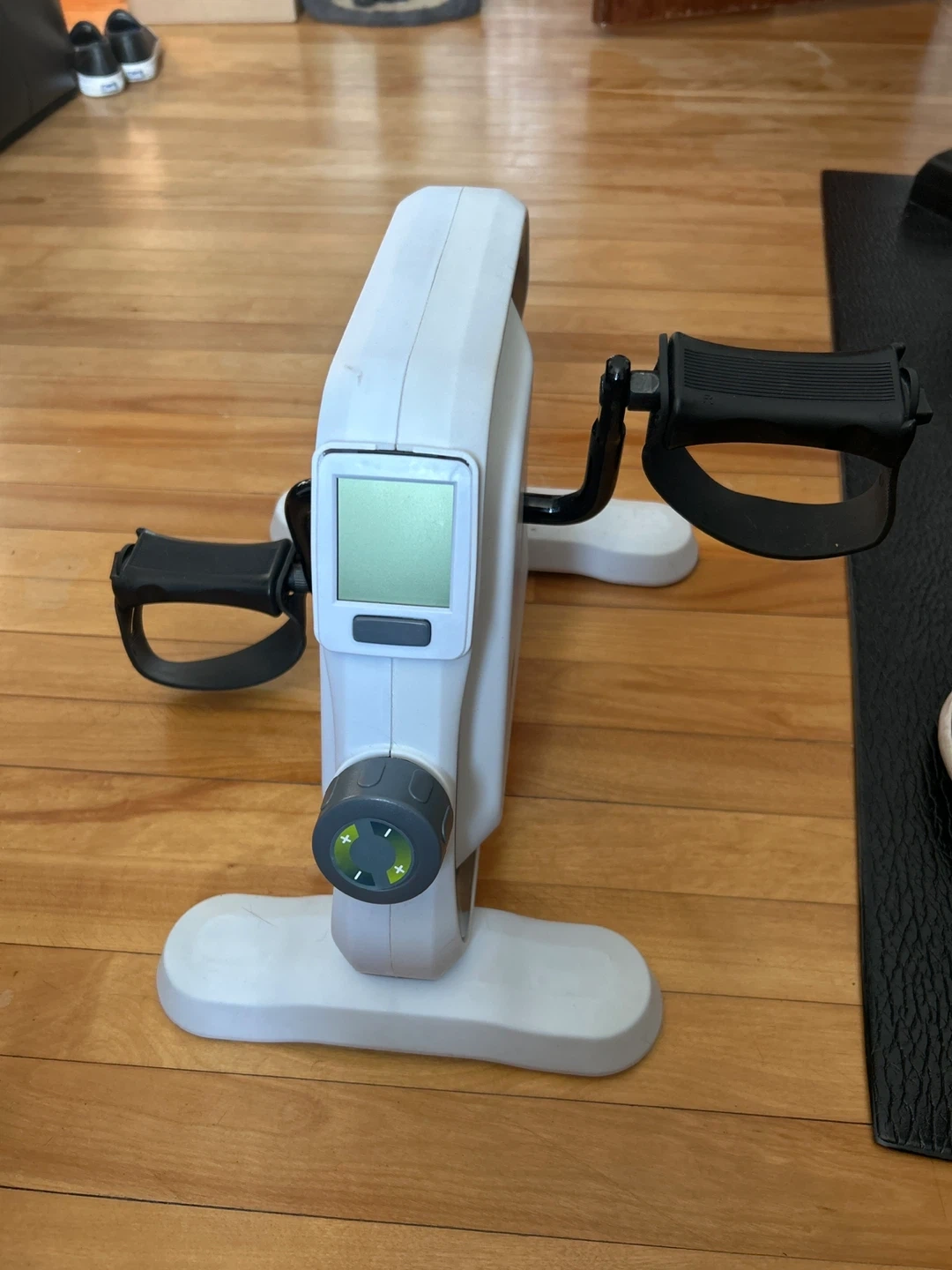 This is a portable pedal exerciser with a digital display. It's great for low-impact workouts at home or in the office. Adjustable tension knob included.