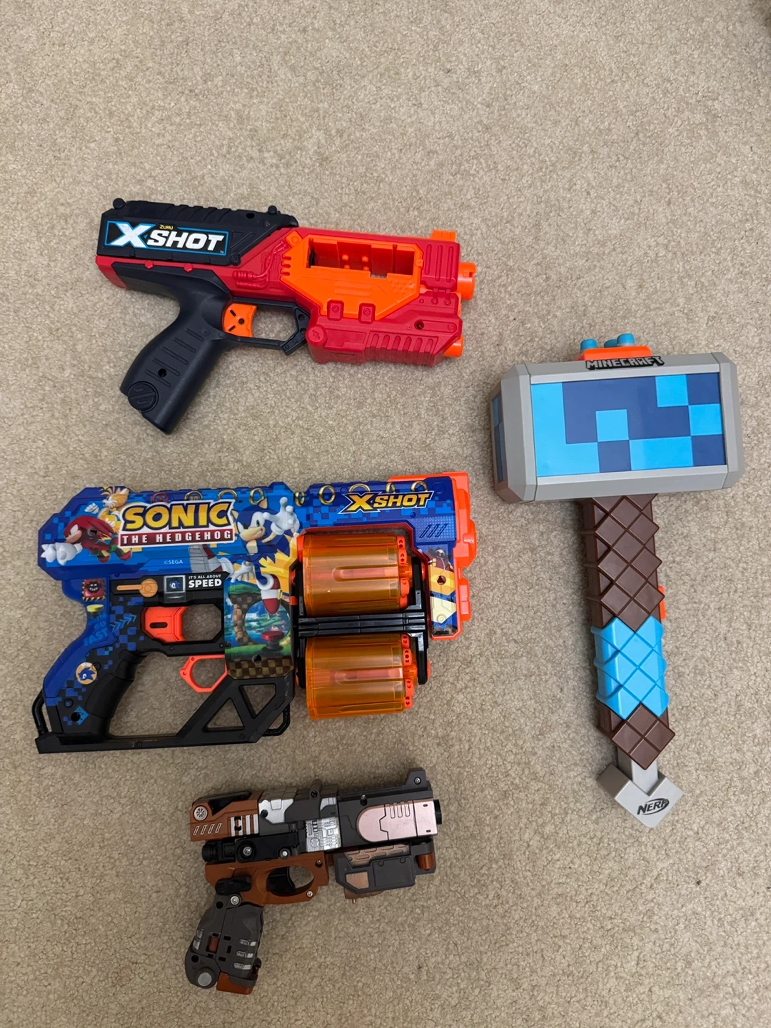 Selling a bundle of toy guns! Includes an XShot blaster, a Sonic the Hedgehog XShot blaster, a Minecraft hammer, and another toy gun. They're in good condition and ready for some fun!