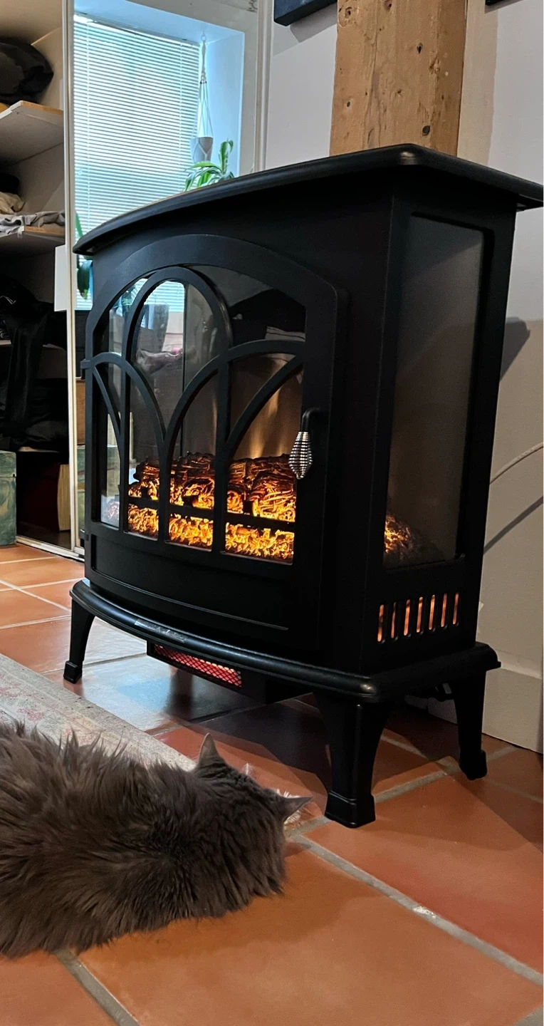 This black electric fireplace stove provides a cozy ambience with its realistic flame effect. It's designed to be a freestanding unit, adding warmth and charm to any room.