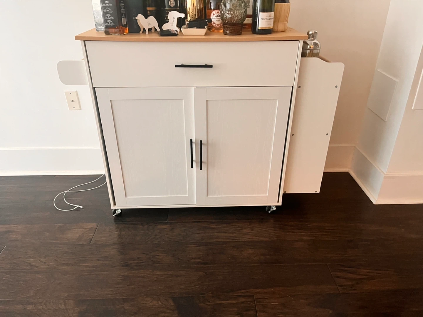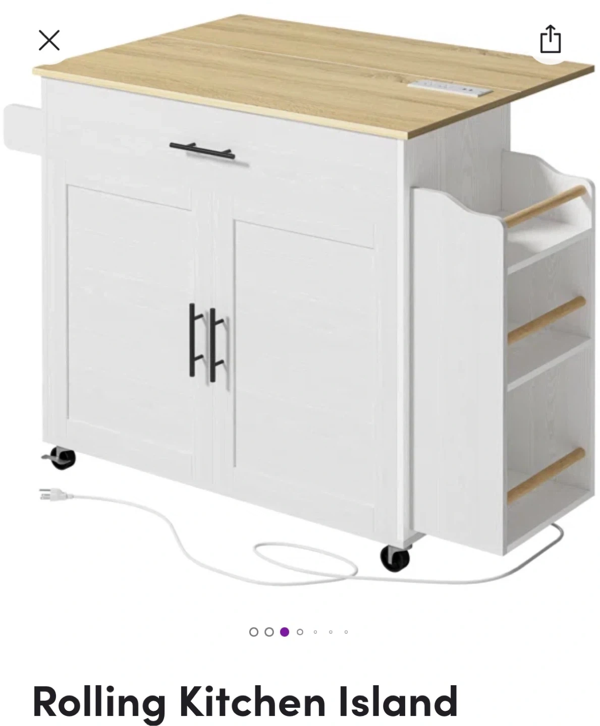 I'm selling a rolling kitchen island, perfect for adding extra counter space and storage to your kitchen. It features a white cabinet base with a light wood countertop.