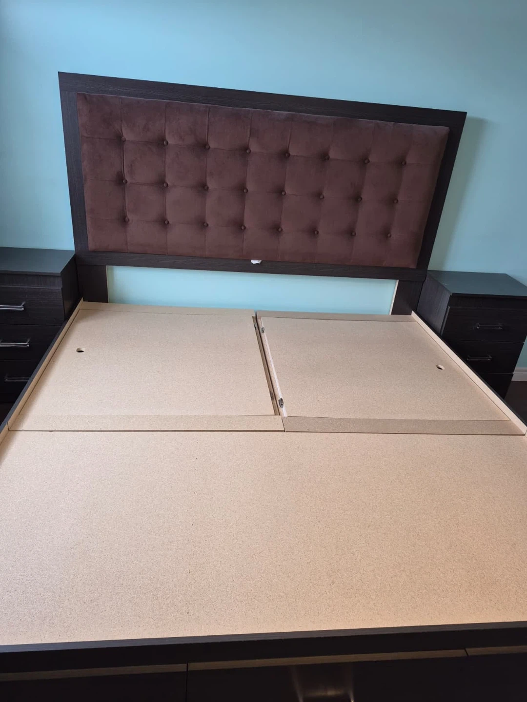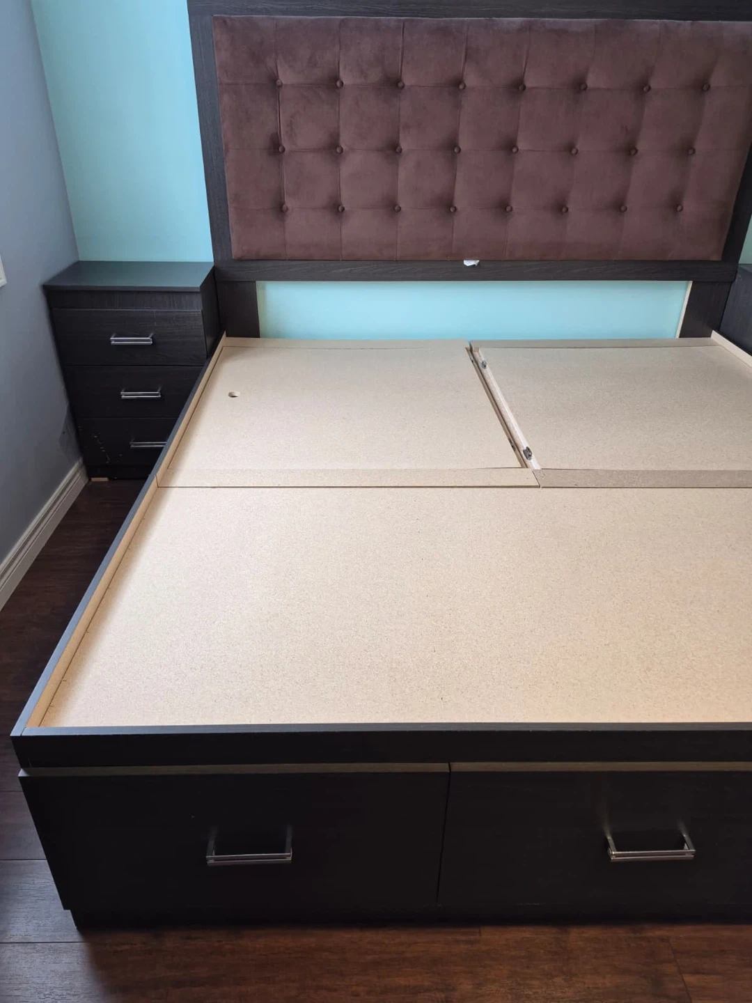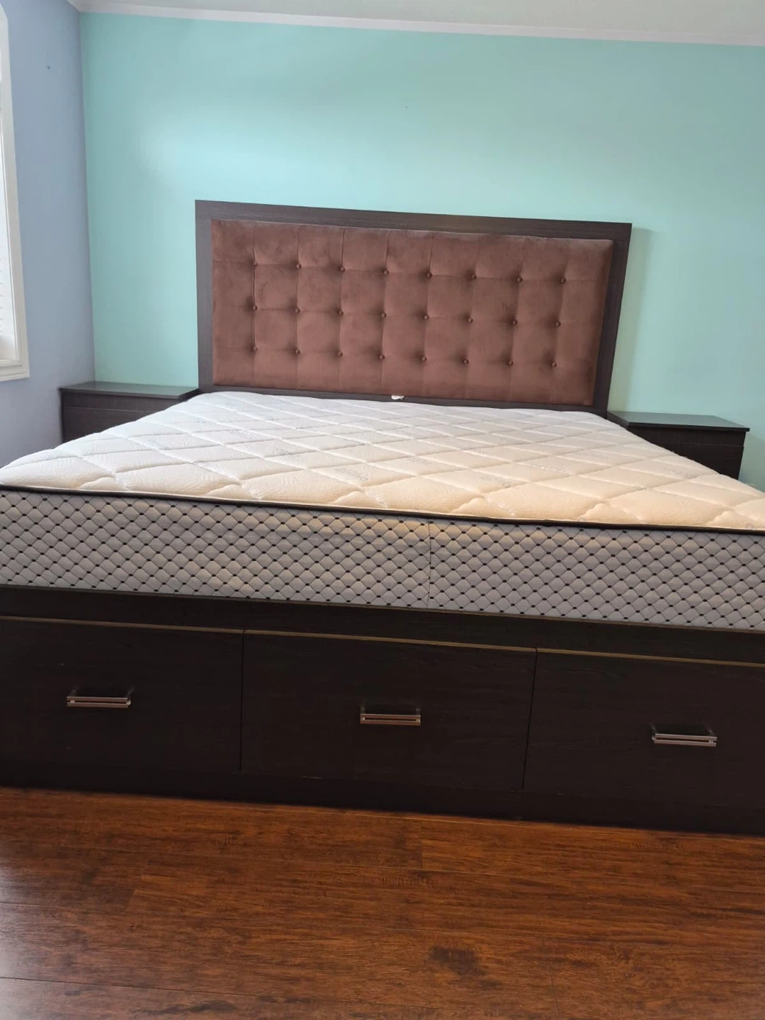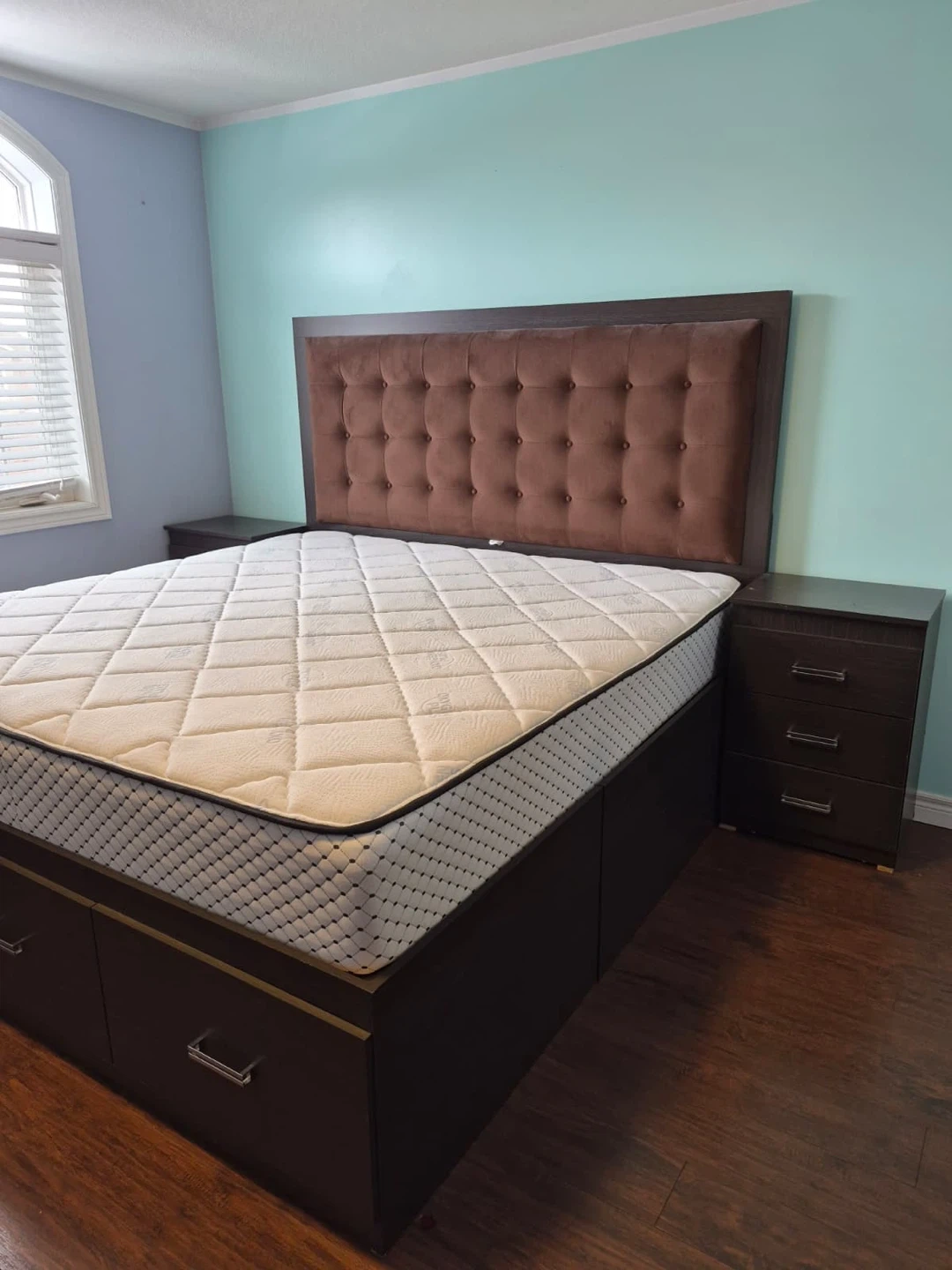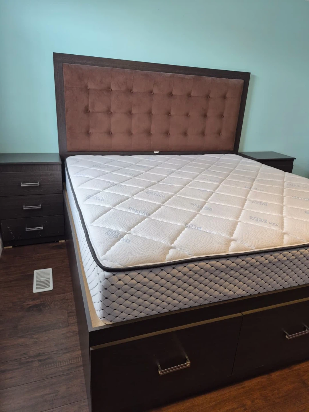 King-size storage bed with upholstered headboard and 2 matching nightstands.Built-in storage (great space saver). Clean and in good condition.Strong and sturdy frame.Selling as a set. Pickup only