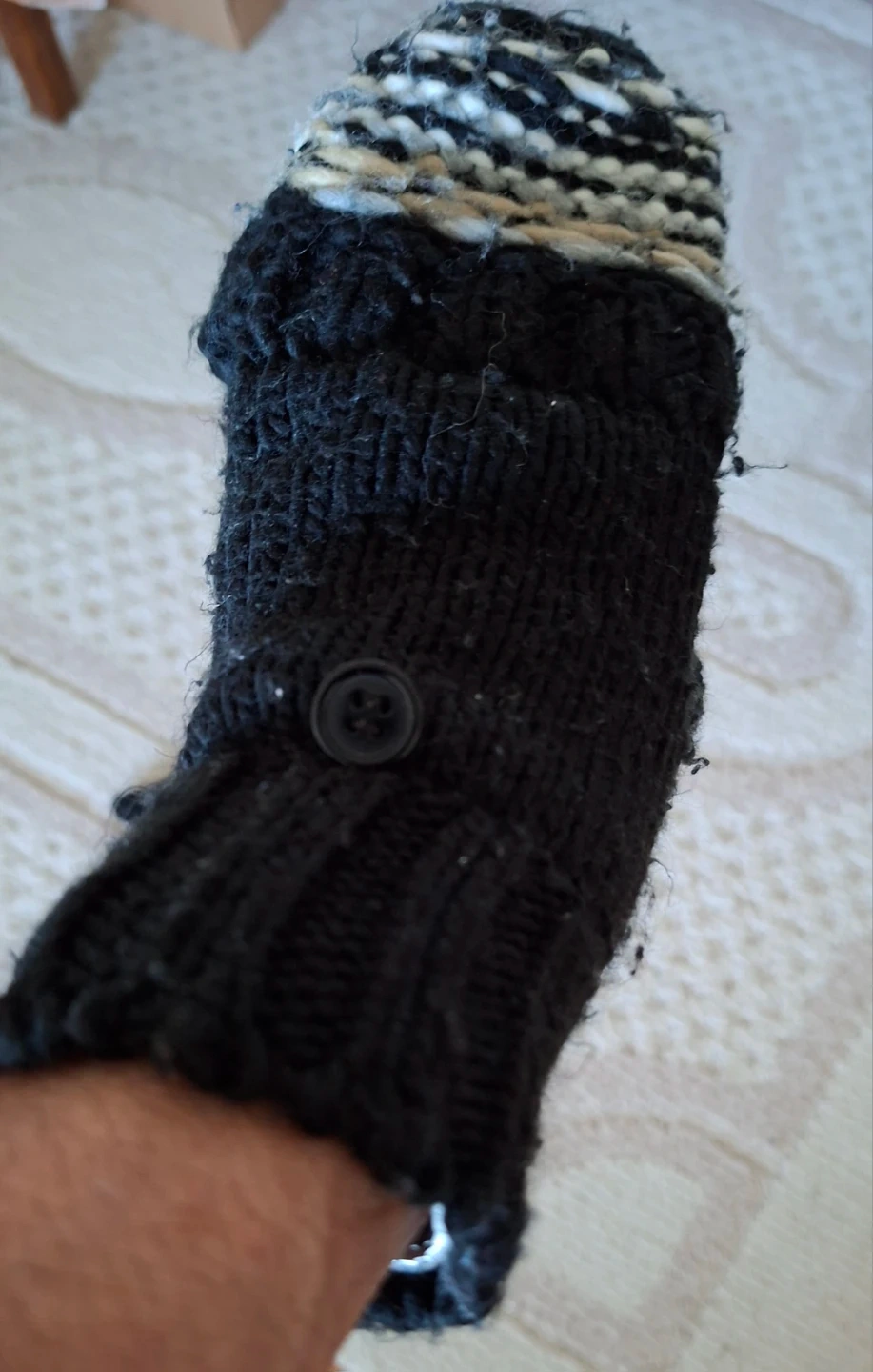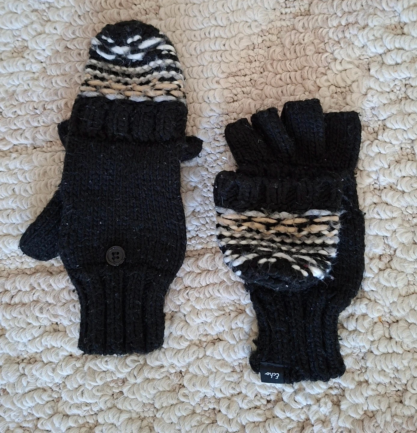 These Echo black knit convertible mittens from Echo. They have a mitten flap that can be secured with a button. The knit material is warm for chilly days. Fingerless glove option is available!