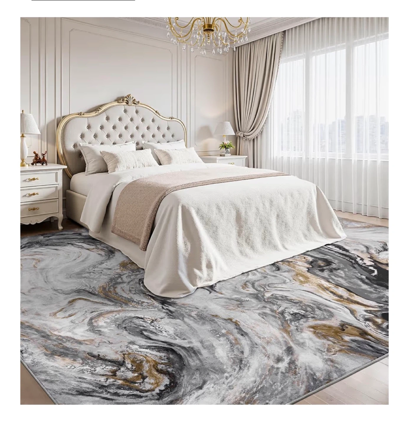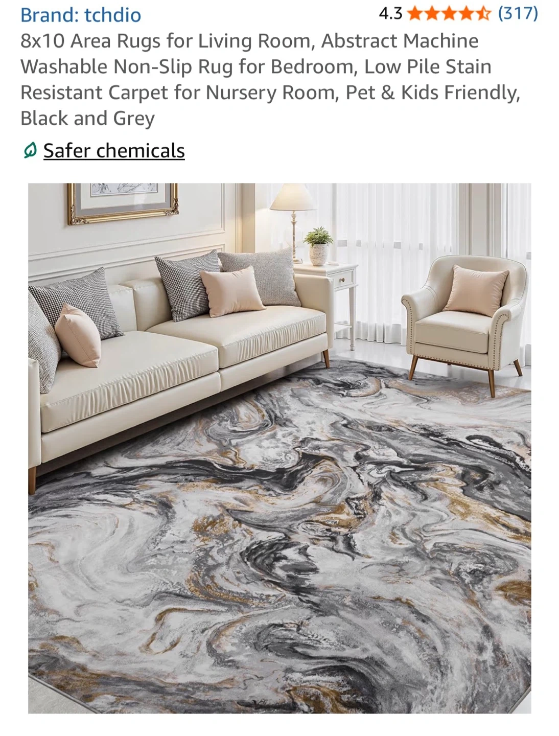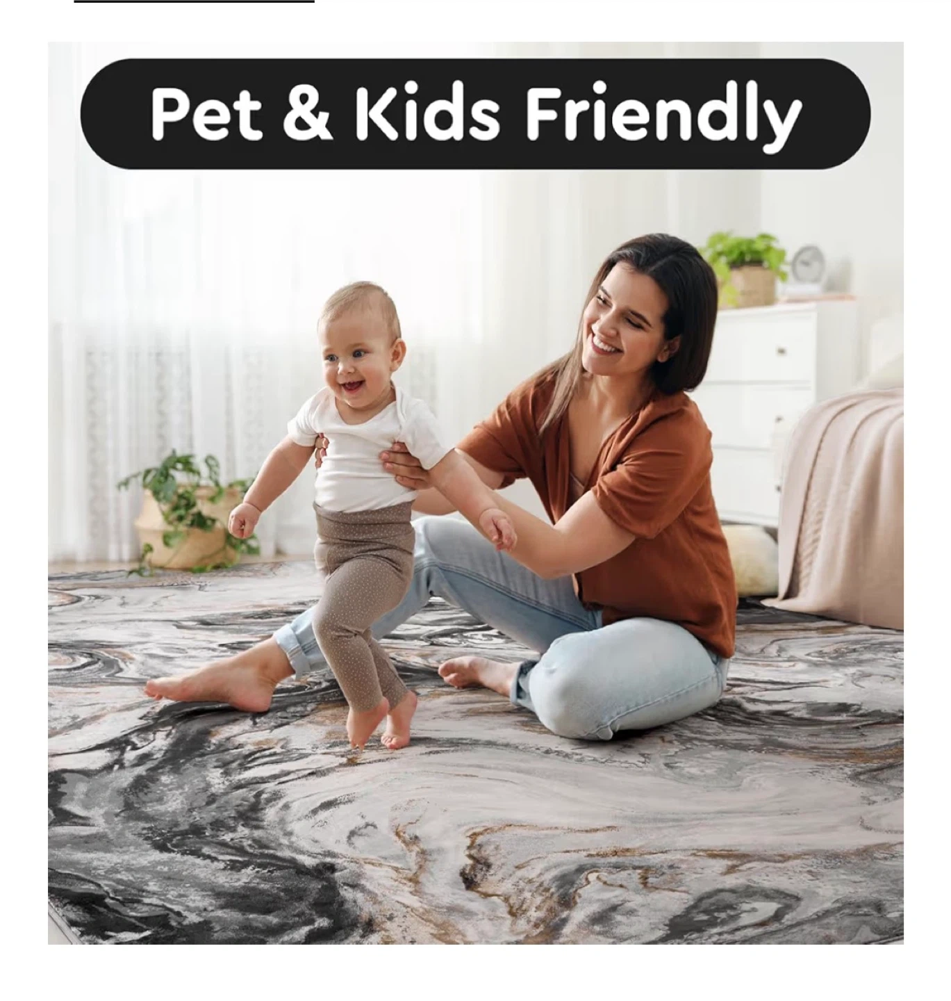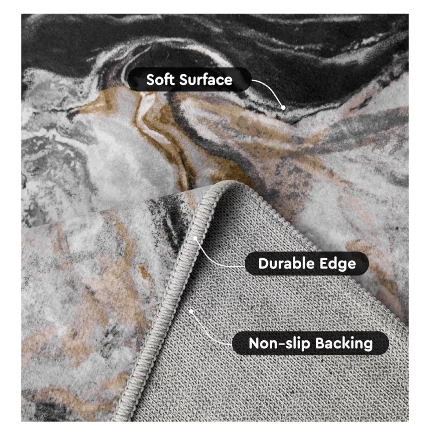This 8x10 area rug features an abstract design in grey, black, and gold tones. It's machine washable and non-slip, making it great for busy households. The low pile is stain-resistant and pet & kids friendly!
