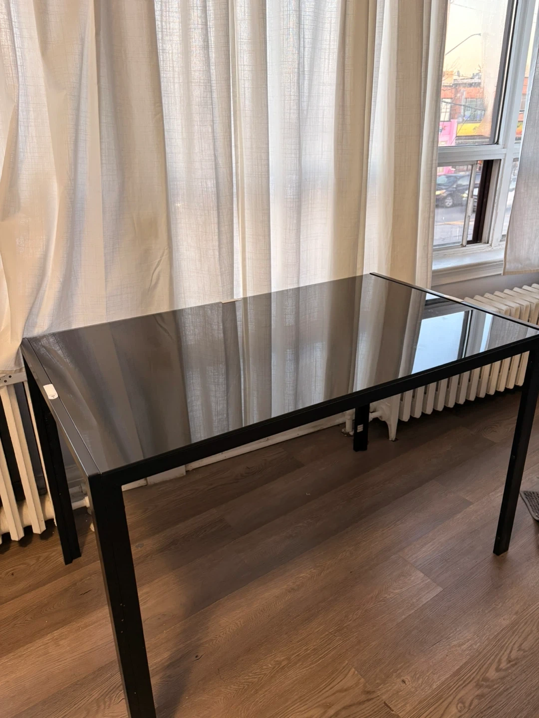 A sleek dining table featuring a glossy black glass top and a sturdy black metal frame. It's suitable for everyday meals or as a stylish addition to your dining space. The minimalist design makes it a versatile fit for various decor styles.