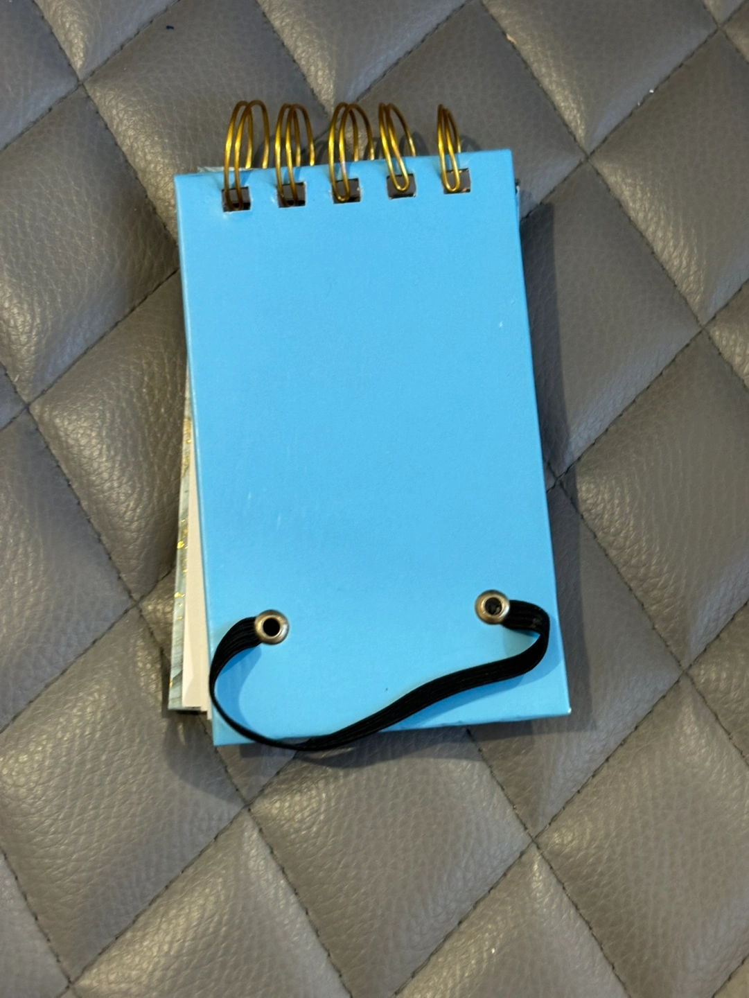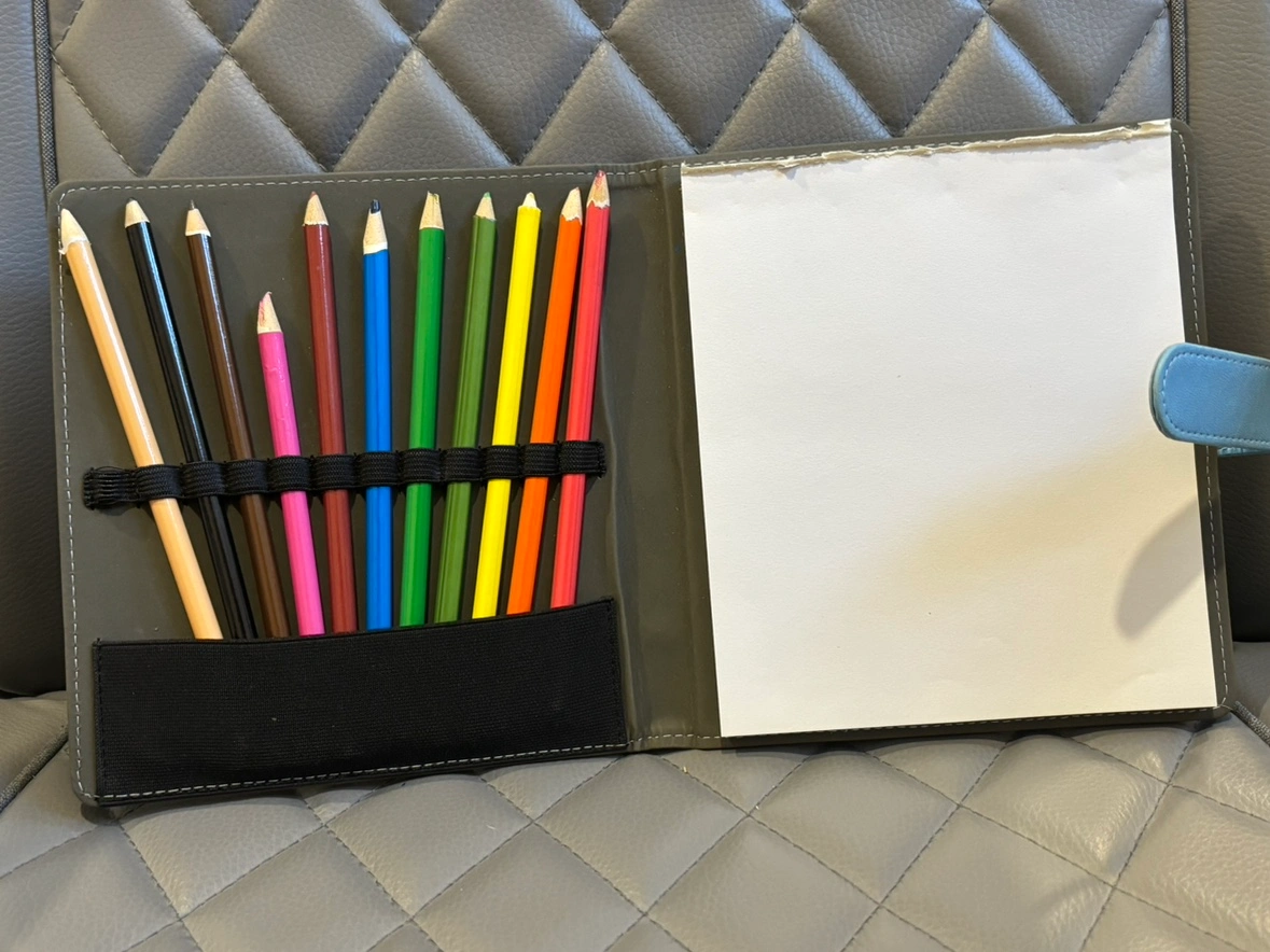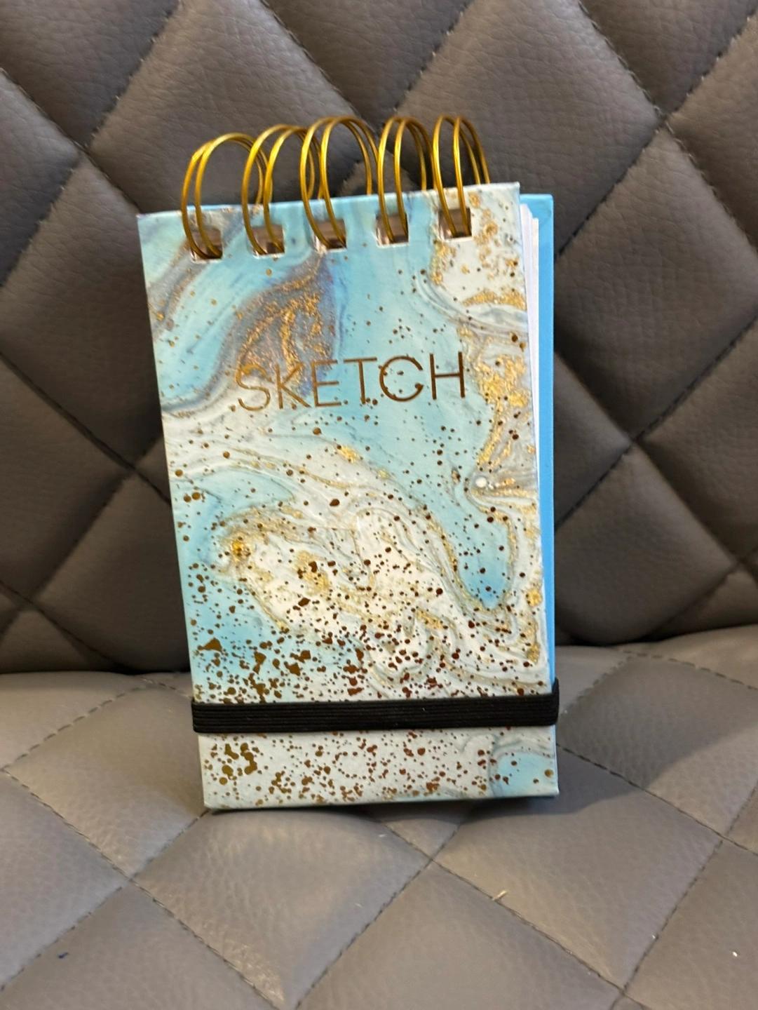 Blue sketch book with a built-in pencil holder. Includes a small notepad and 10 pencils. This is a bundle of oragami paper and used sketchbook and notepad.
