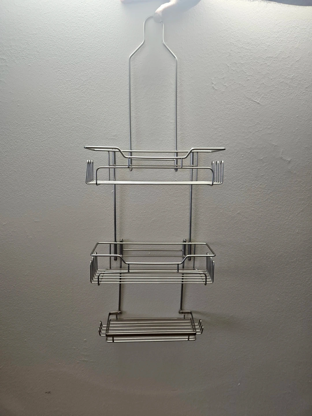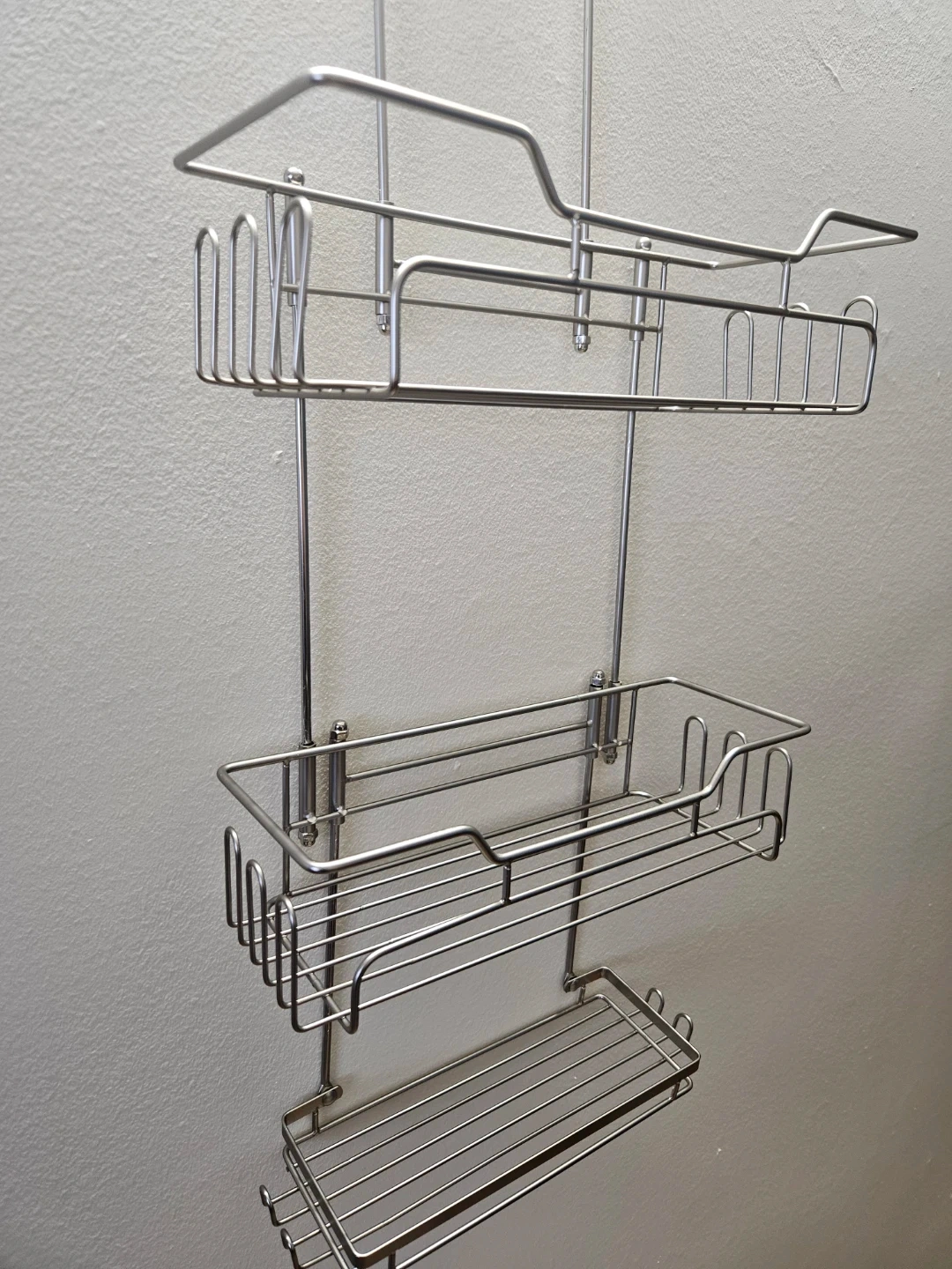 This is a 3-tier hanging shower caddy with a stainless steel construction. It's approximately 28 inches long. Includes mounting hardware. Great for organizing your bathroom essentials!