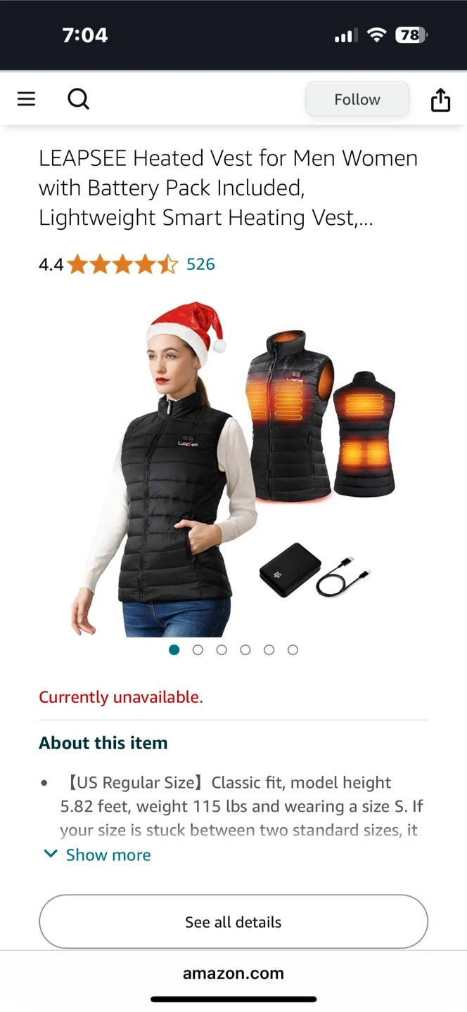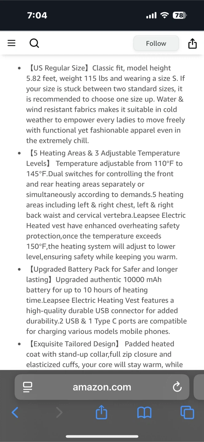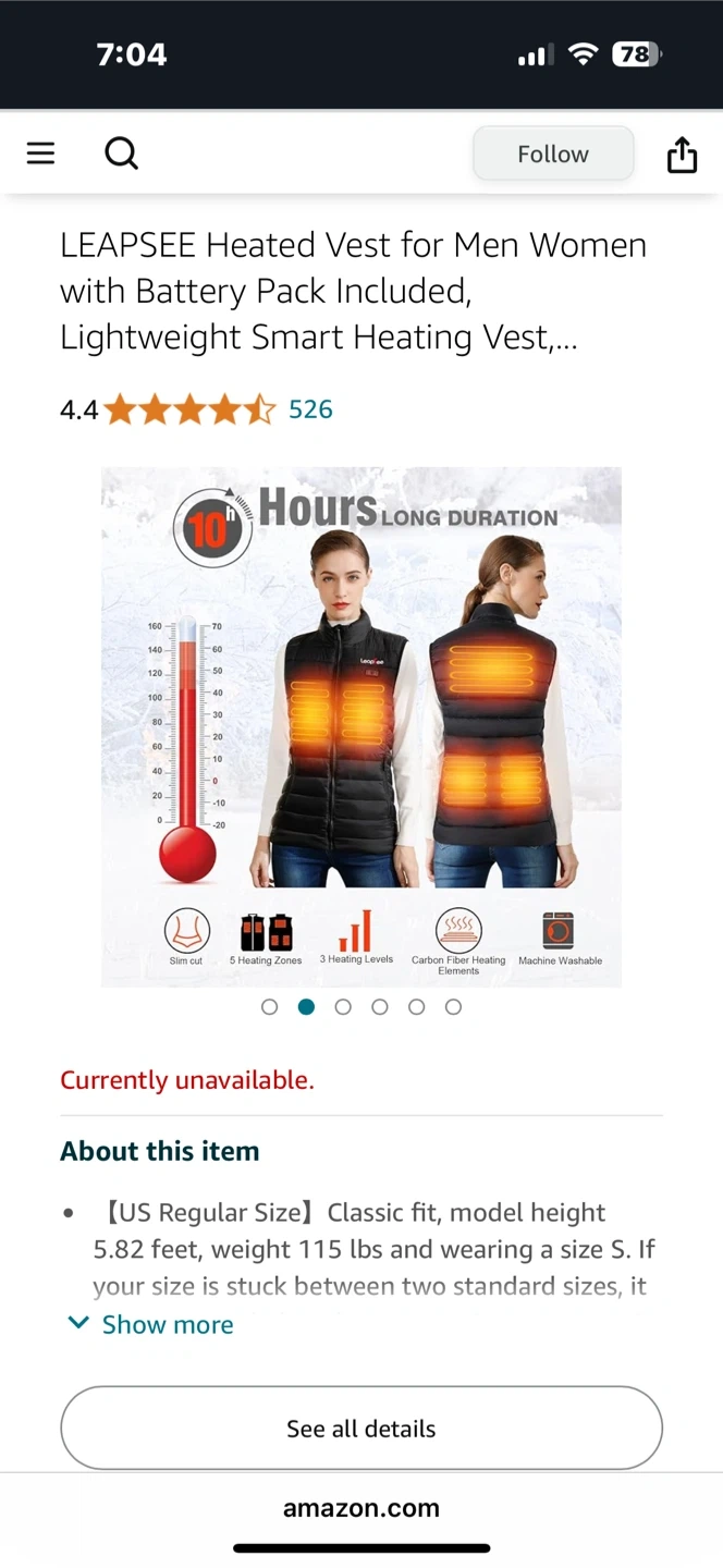 This LEAPSEE heated vest is designed for warmth and comfort. It features 5 heating zones and 3 adjustable temperature levels, with a battery pack offering up to 10 hours of heating time. The vest is water & wind resistant and machine washable. It's suitable for colder weather and functional everyday wear.
