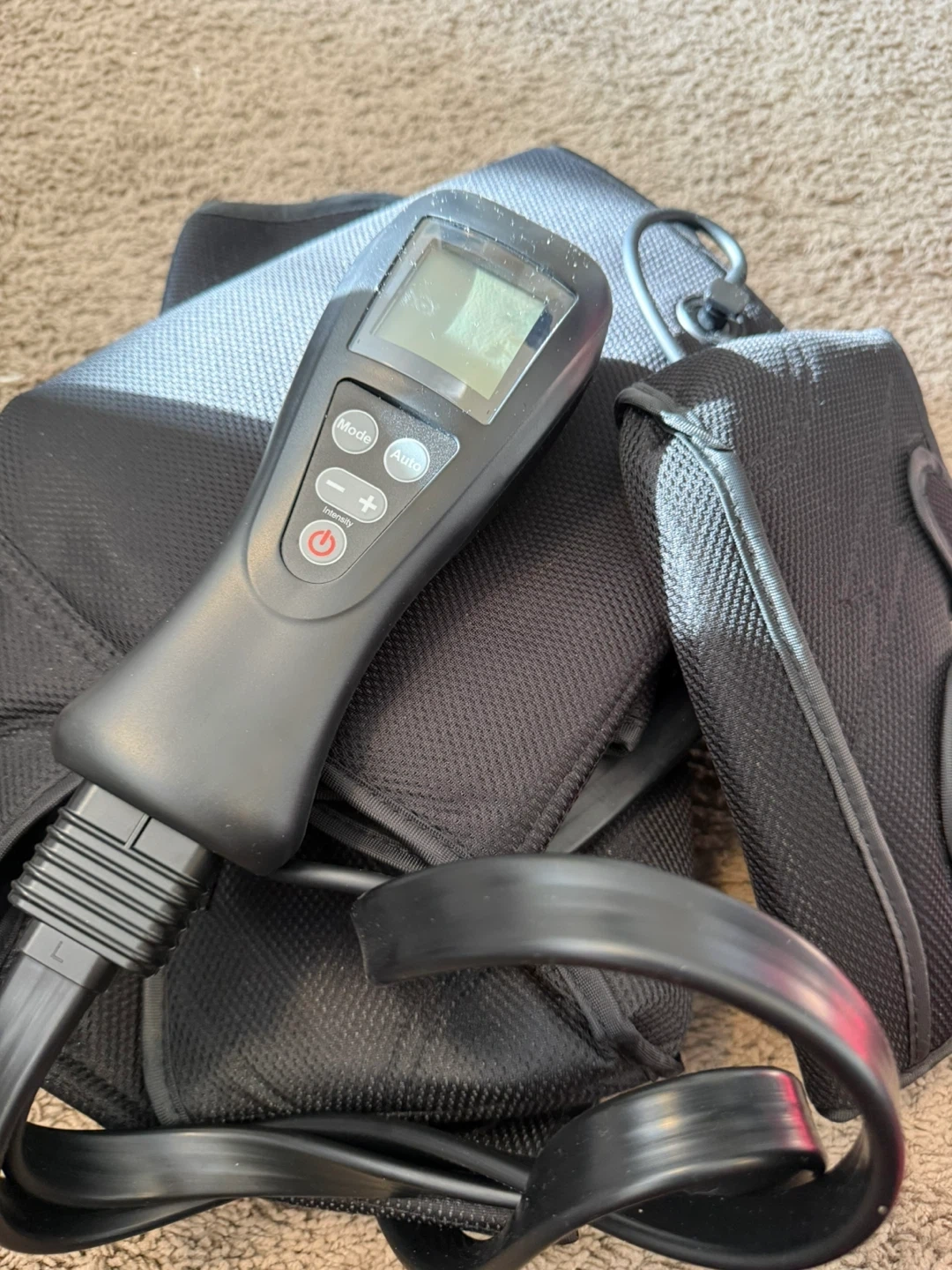 This FitPulse massager comes with a remote control and a travel bag. It features multiple modes and intensity settings for a customizable massage experience. It's great for relaxing tired feet after a long day!