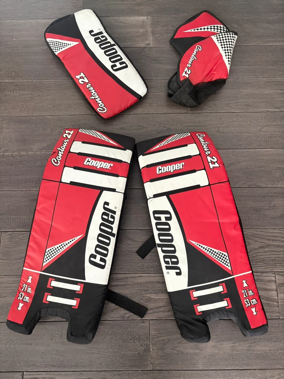 Cooper Contour 21 goalie leg pads and a blocker. The leg pads are 21 inches (53 cm) long. They're red, white, and black.