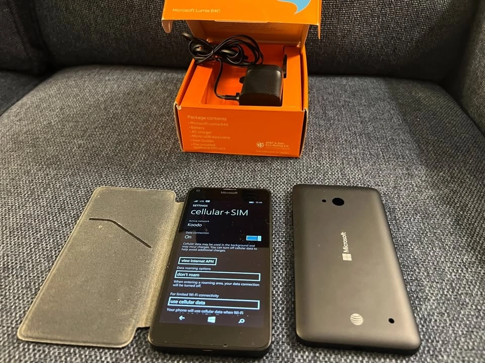 For sale is a Microsoft Lumia 640 cell phone in Like New condition. Comes complete in box with original charging cable, original backplate, and an additional credit card cover/backplate. This phone is known for its excellent battery life, lasting for multiple days. It's unlocked (originally from AT&T) and has been tested to work with a Canadian SIM card. The phone runs Windows Phone 8.1 Update 2. It uses a Micro-SIM card and has a Micro-SD card slot for expandable storage. Pick up in Point Grey.
