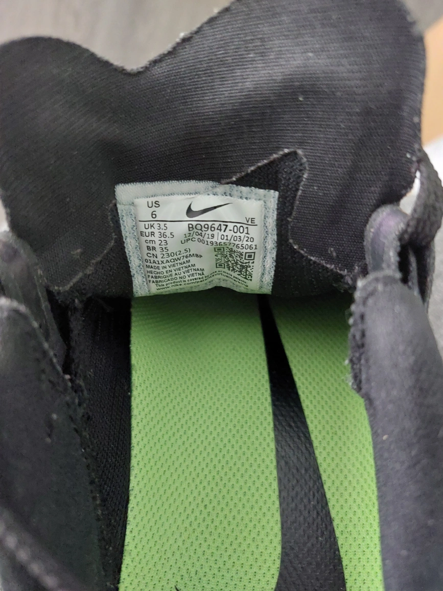 Black and neon green Nike Air Zoom Pegasus 37 running shoes. Women's US size 6, EU size 36.5, UK size 3.5. These shoes are designed for performance running.